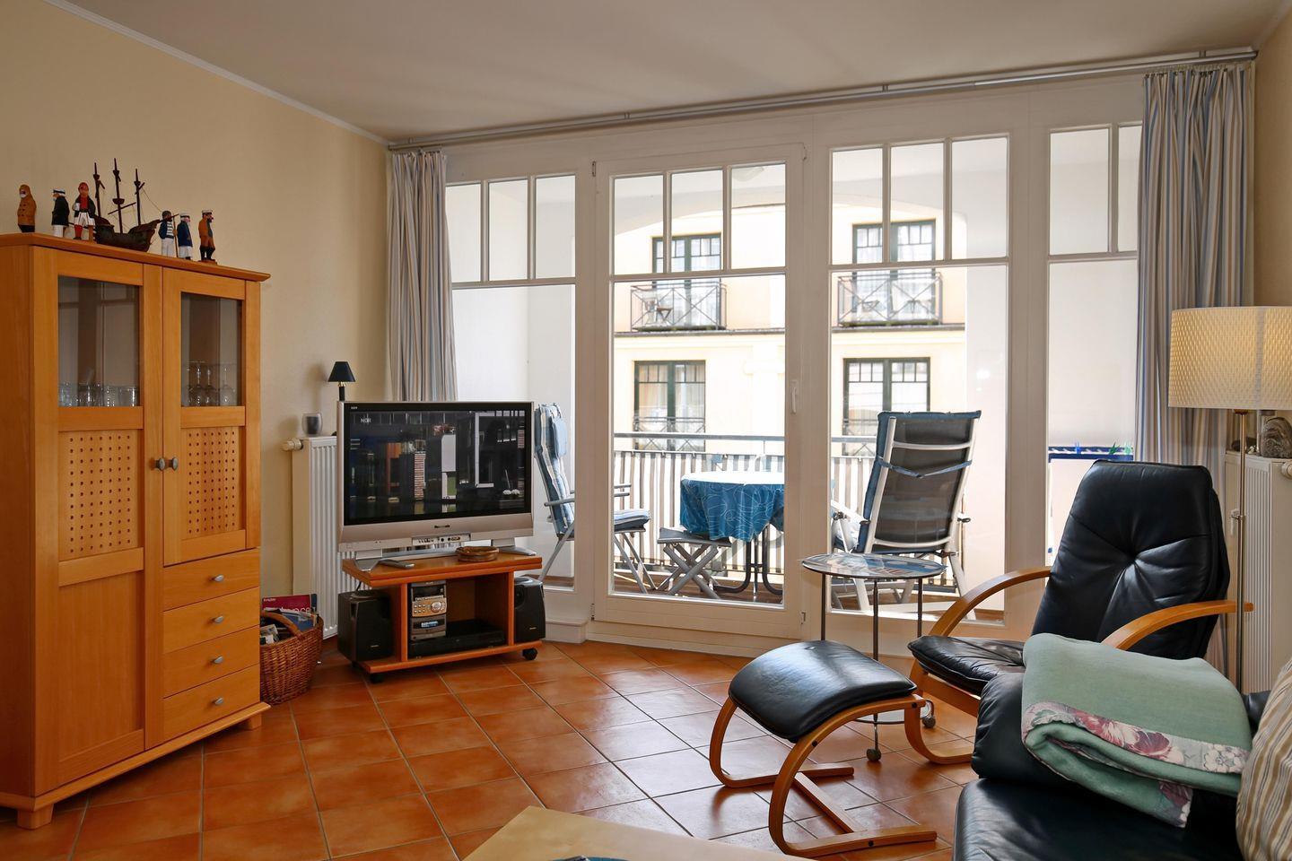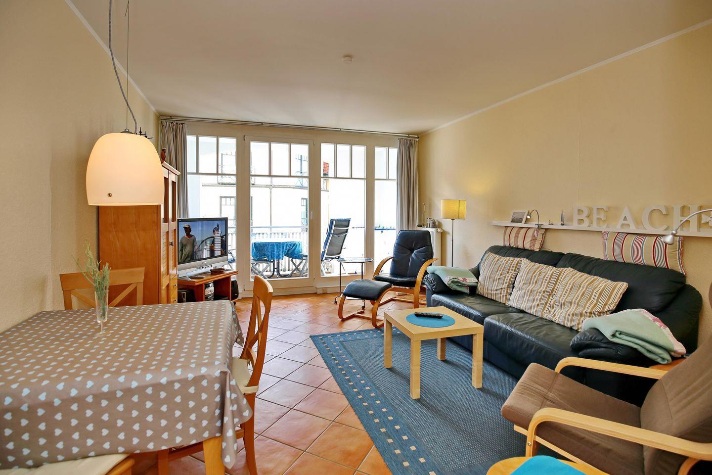 Die Ferienwohnung Nr. 122 in der Ferienanlage Meeresblick ist eine 2-Zimmer-Wohnung für bis zu 3 Personen. Die Wohnung liegt in der 1. Etage auf der Westseite des Hauses und verfügt über einen Balkon, auf dem Sie die Nachmittagssonne und einen Teilseeblick genießen können.