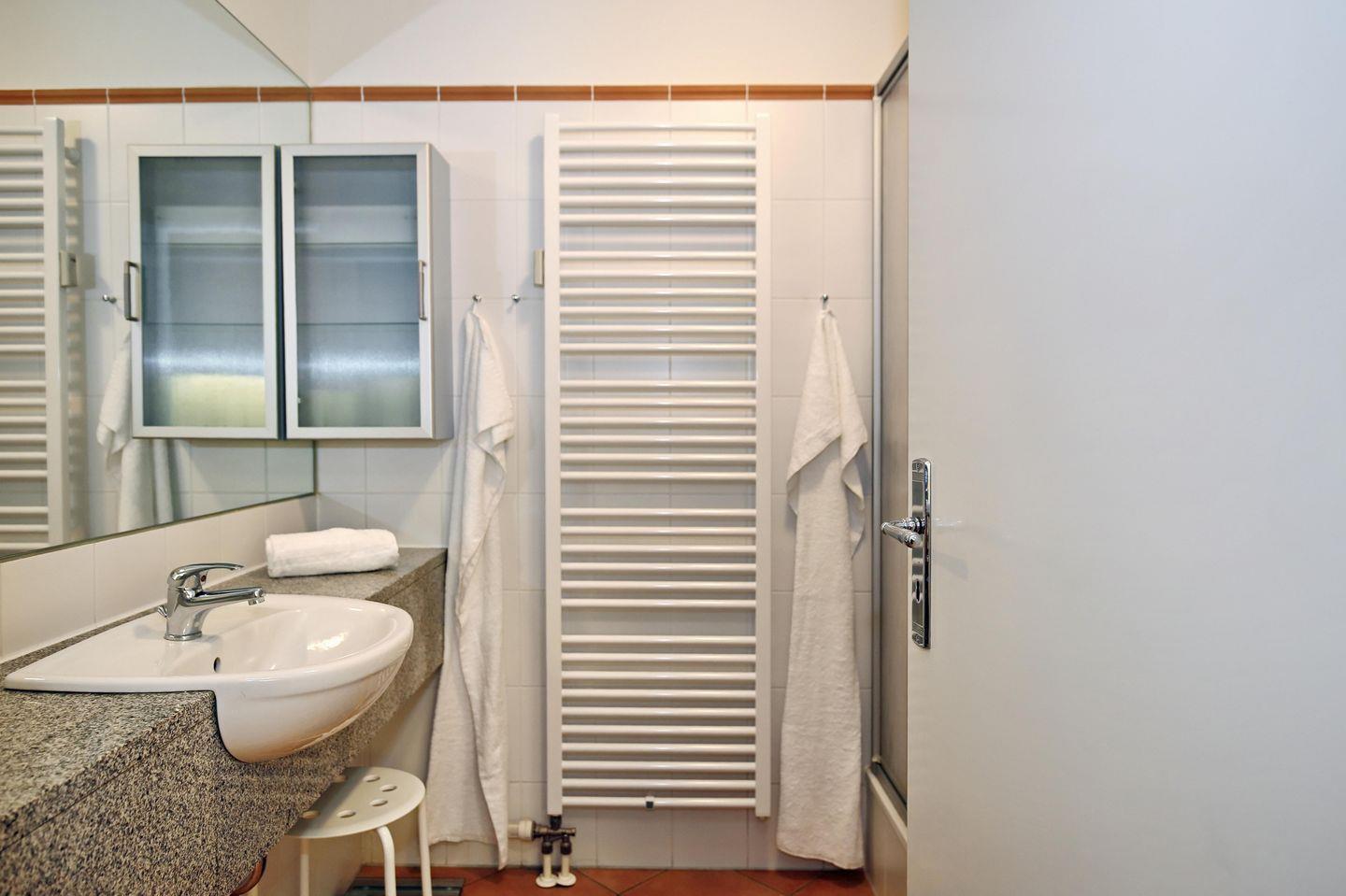 Die Ferienwohnung verfügt über ein gefliestes Duschbad mit WC. Für deine Waschutensilien findest du genügend Platz auf dem großzügigen Waschtisch. Ein Föhn komplettiert die Ausstattung des Bades. Im gesamten Wohn- und Schlafbereich sowie im Flur wurden Fliesen verlegt. In dieser Nichtraucherwohnung sind Haustiere nicht erlaubt.