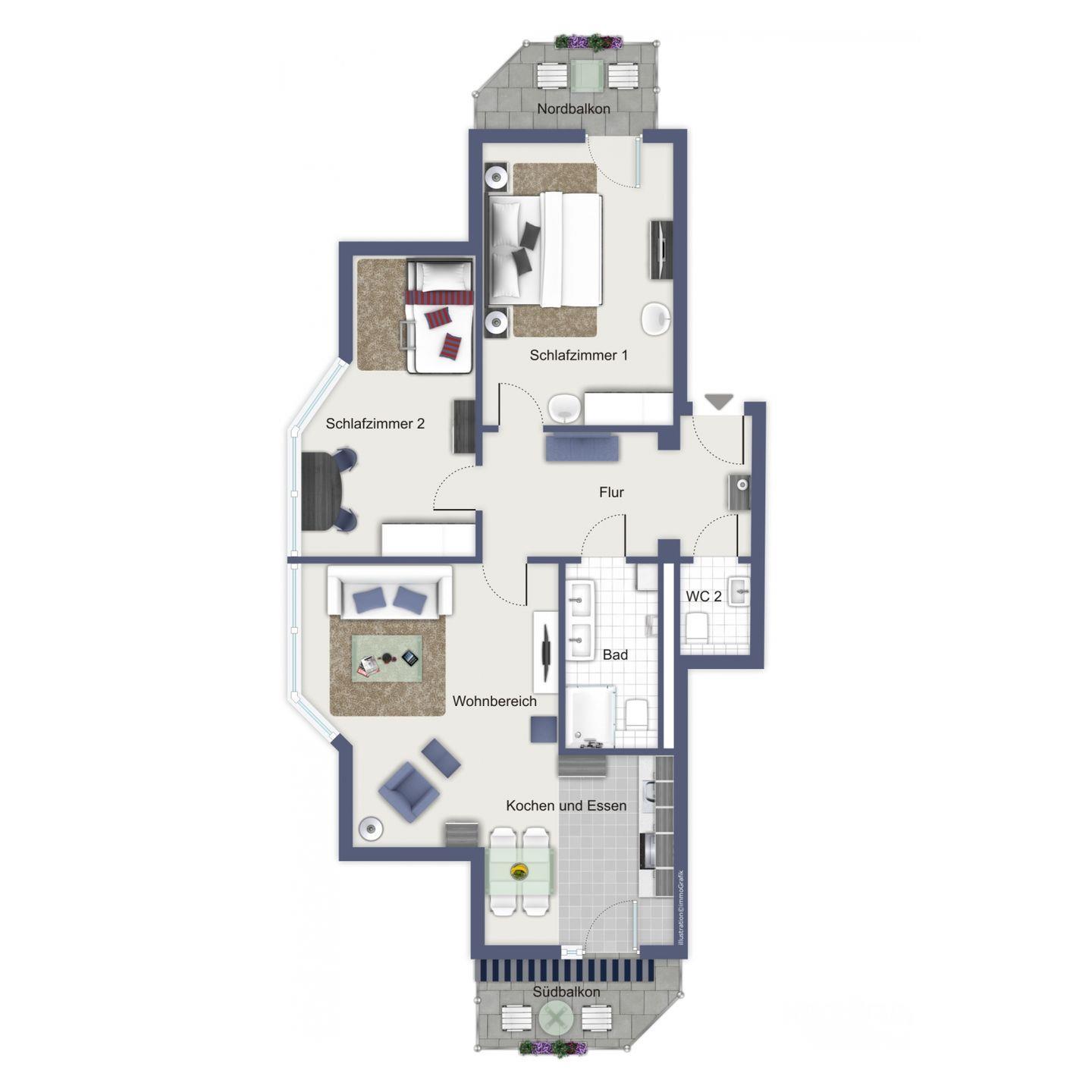 Das erste Schlafzimmer empfängt dich mit einem Doppelbett (2 x 90 cm x 200 cm), zwei Nachtschränkchen mit zwei Radio-Weckern, einem Kleiderschrank und einer Kommode. Über der Kommode befindet sich ein zusätzlicher Flachbild-TV. Von hier aus gelangst du auf den Nordbalkon mit Blick auf den Hafen und die Strandstraße. Im zweiten Schlafzimmer befinden sich ein Etagenbett (2 x 90 cm x 200 cm), ein geräumiger Kleiderschrank sowie vor dem Fenster ein Tisch mit zwei Stühlen. In beiden Schlafzimmern dienen dir Vorhänge an den Fenstern zur Verdunklung.