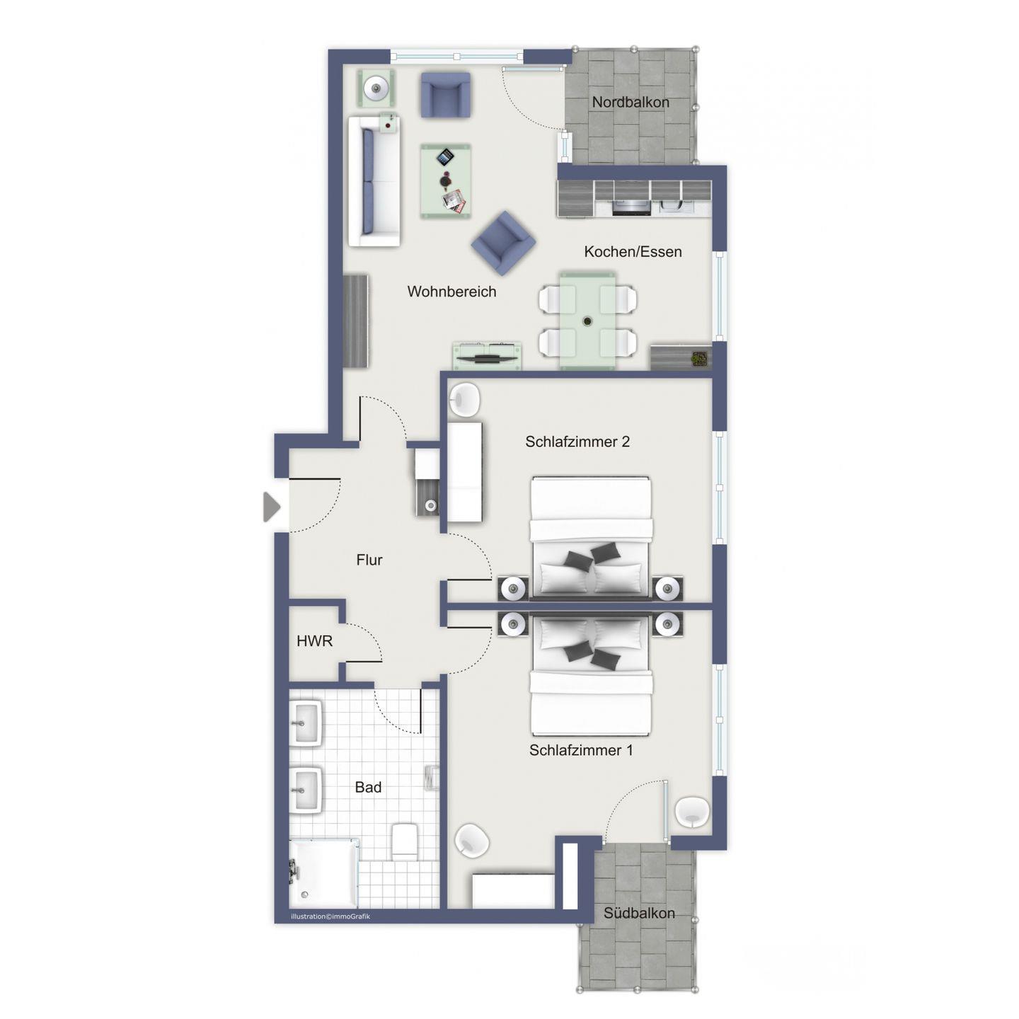 Die Ferienwohnung 313 in der Villa Hanse ist eine 3-Zimmer-Wohnung mit einer Größe von etwa 57 m². Zu der Wohnung gehören zwei Balkone.