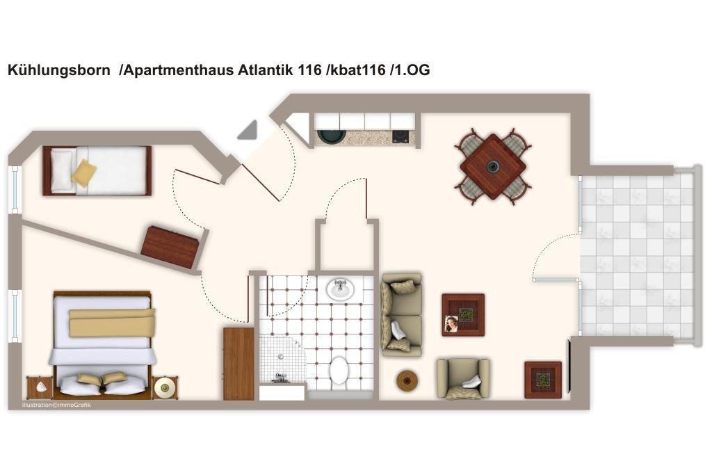 Das helle und gemütliche Nichtraucher-Apartment verfügt über WLAN und eine voll ausgestattete offene Küche mit einer Mikrowelle, einer Kaffeemaschine, einem Wasserkocher, einem Toaster, einer Geschirrspülmaschine sowie einem Minibackofen. Im kombinierten Wohn- und Essbereich stehen euch eine HiFi-Anlage, ein Flachbild-TV und ein Blue-Ray-Player zur Verfügung. Sowohl der Esstisch, als auch der behagliche Sitzbereich bieten genügend Platz, um schöne Stunden beim Frühstück oder nach einem ereignisreichen Tag am Strand zu verbringen. Die Wohnung verfügt über zwei separate Schlafzimmer: ein Schlafzimmer mit einem Doppelbett (1,80 x 2,00 m), ein weiteres mit einem Ausziehbett mit zwei Einzelbetten (0,80 x 2,00 m). Beide Schlafzimmer sind mit Teppichboden ausgestattet. Ein Kinderbett kann gegen Entgelt aufgestellt werden und auf Wunsch könnt ihr einen Hochstuhl hinzubuchen. Besonderes Highlight der Wohnung ist der möblierte und überdachte Balkon, von dem ihr einen seitlichen Meerblick auf die nahegelegene Ostsee habt.