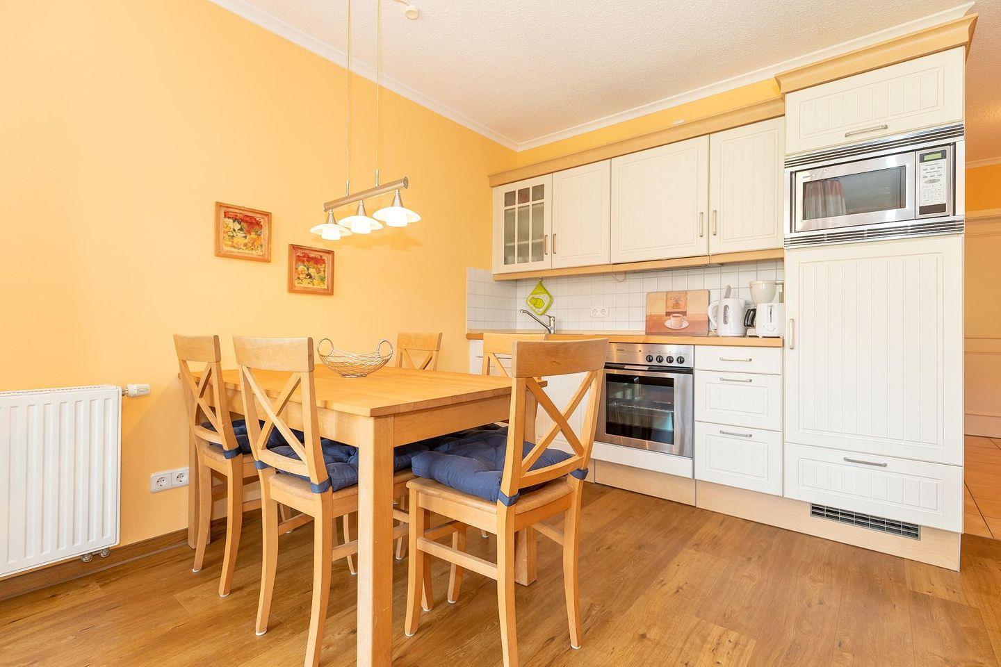 Zur Ausstattung des Apartments gehören eine offene Küche mit Backofen, Mikrowelle und Geschirrspüler sowie ein Föhn, Minisafe, Bügeleisen mit Bügelbrett, ein TV, eine HiFi-Anlage und ein DVD-Player. Ein Hochstuhl und ein Kinderbett stellen wir euch auf Wunsch und gegen Entgelt zur Verfügung – das Kinderbett ist vor dem Schrank im Schlafzimmer stellbar.