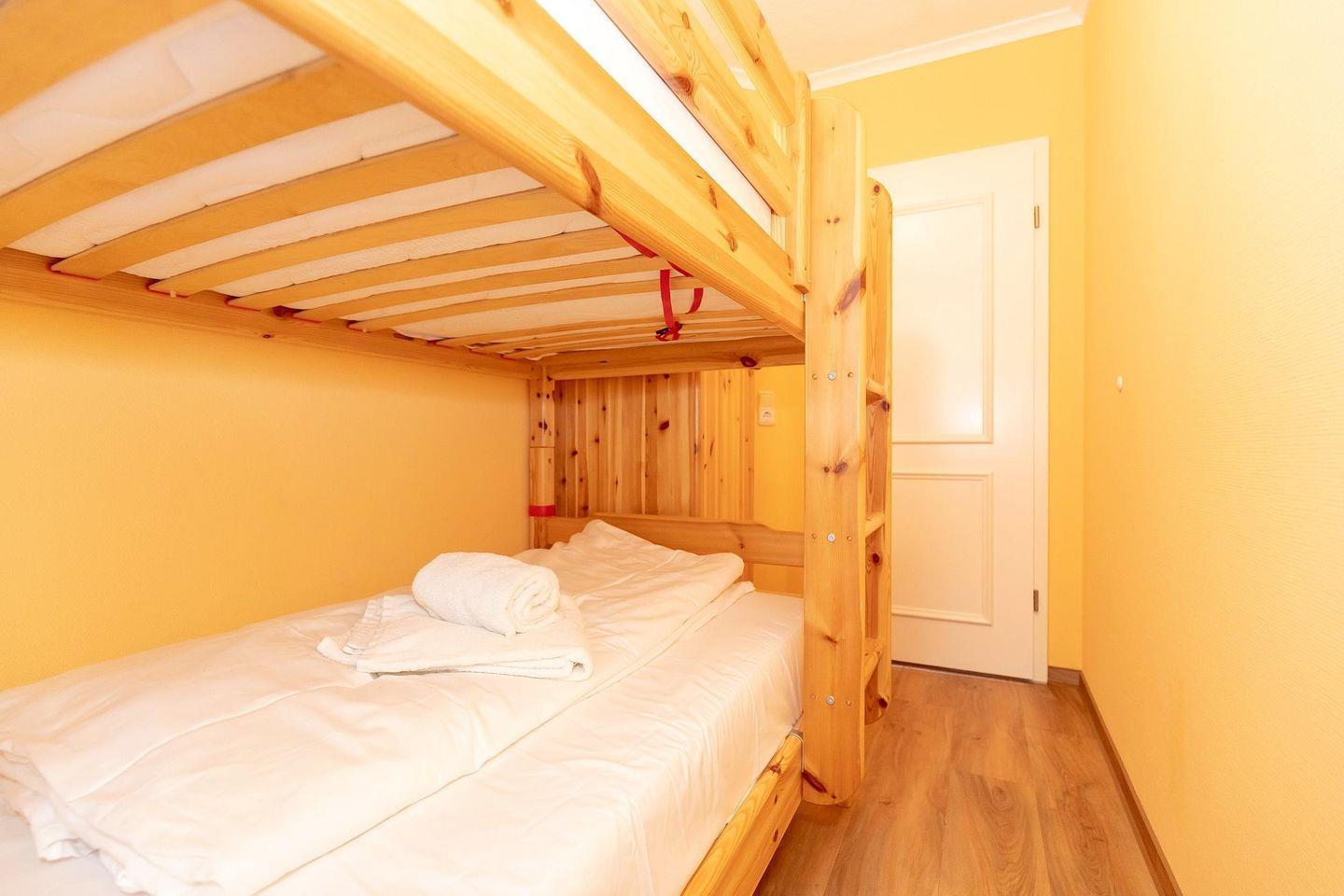 Die Ferienwohnung ist mit Teppichboden ausgestattet und besteht aus 2 Schlafzimmern mit Doppelbett bzw. einem Etagenbett, einem Wohnbereich mit Doppelschlafcouch und einer Loggia mit seitlichem Meerblick Richtung Seebrücke.