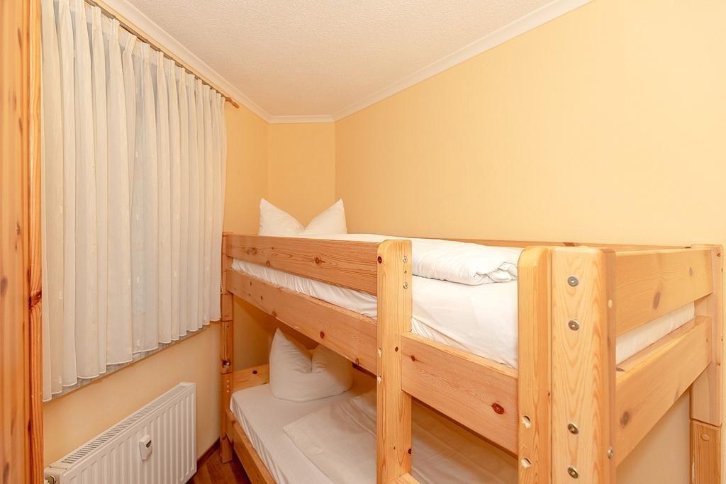 In der Ferienwohnung befinden sich zwei Schlafzimmer mit Doppelbett bzw. einem Etagenbett, ein offener Wohn-Essbereich mit Zugang zum Balkon sowie ein Badezimmer mit Dusche, Handtuchheizkörper, Föhn und Kosmetikspiegel.