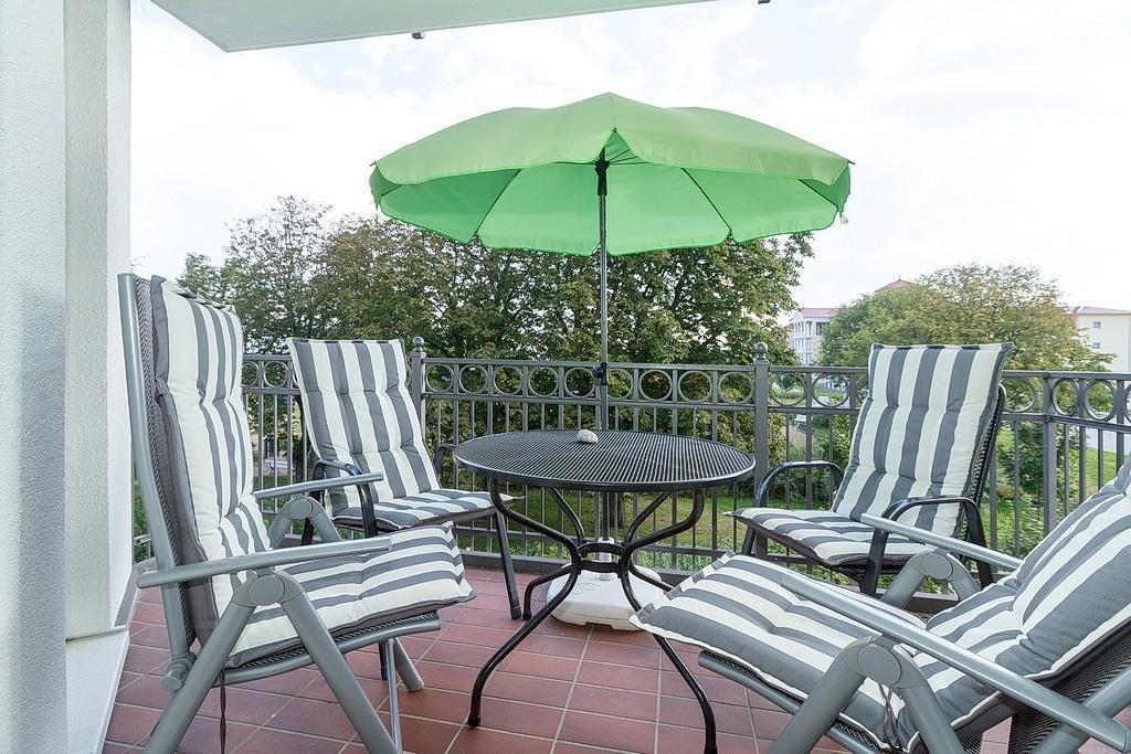 Der Balkon hat einen seitlichen Blick auf die Ostsee, ist überdacht und liegt Richtung Osten.