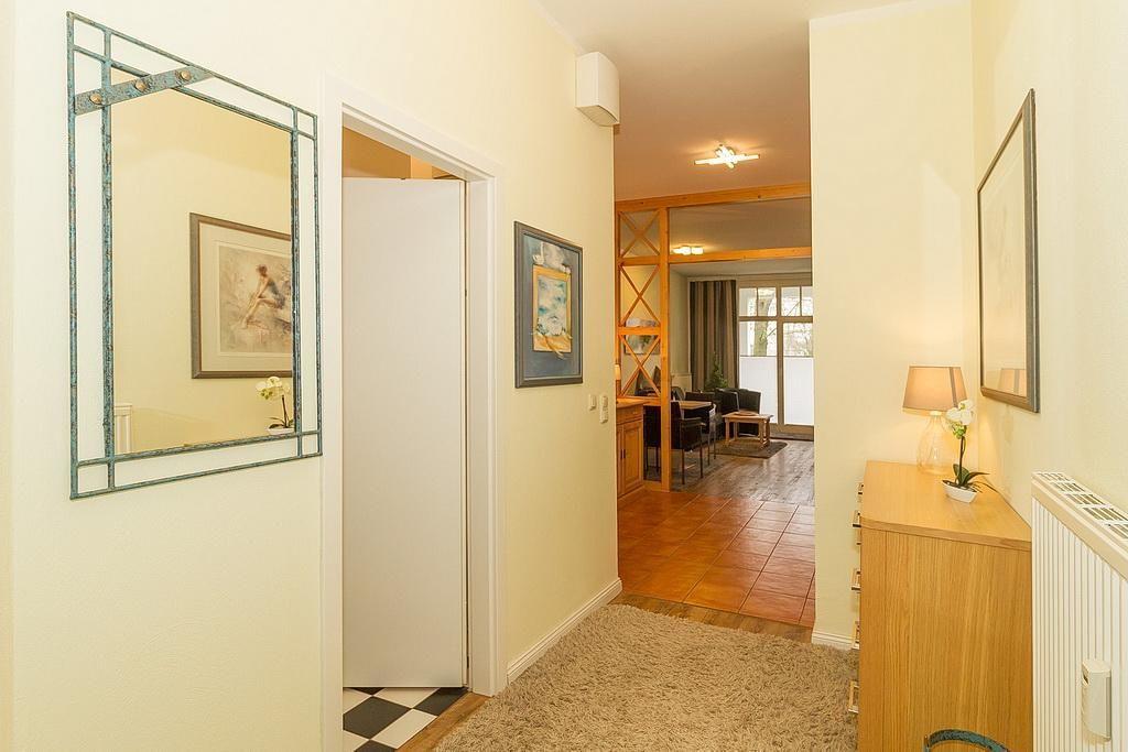 Das Nichtraucher-Apartment verfügt über kostenfreies WLAN und eine voll ausgestattete offene Küche mit Geschirrspüler, Mikrowelle, Wasserkocher, Kaffeemaschine, Toaster und Tiefkühlfach. Der kombinierte Wohn- und Essbereich verfügt über eine TV-HiFi-Anlage mit Flachbild-TV. Sowohl der Esstisch, als auch der behagliche Sitzbereich mit Schlafcouch bieten genügend Platz, um schöne Stunden beim Frühstück oder nach einem ereignisreichen Tag am Strand zu verbringen. Das separate Schlafzimmer ist ausgestattet mit einem großen Boxspringbett (2 x 0,90 x 2,00). Das Schlafzimmerfenster liegt zum Atrium, dem begrünten, überdachten Innenhof des Gebäudes. Die Wohnung verfügt über eine kleine, überdachte Terrasse in Ost-Lage.