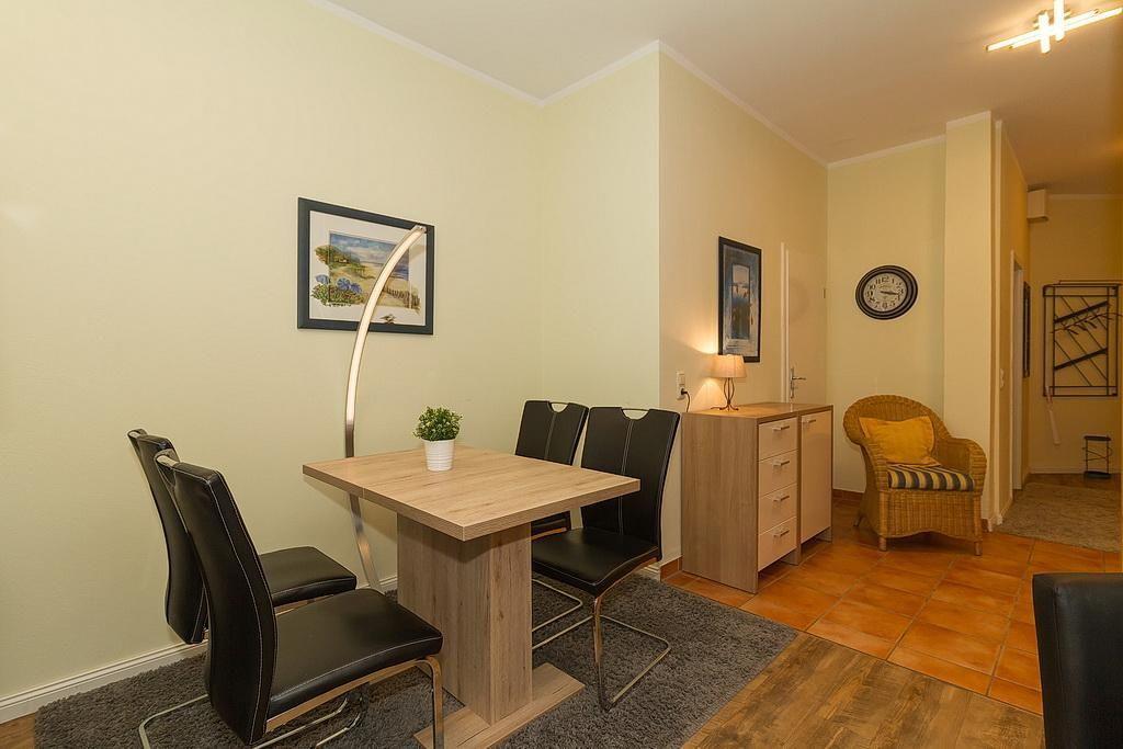 Das freundlich eingerichtete Nichtraucher-Apartment verfügt über kostenfreies WLAN und eine voll ausgestattete offene Küche mit Geschirrspüler, Mikrowelle inklusive Grillfunktion, Wasserkocher, Kaffeemaschine, Toaster und Tiefkühlfach. Der kombinierte Wohn- und Essbereich verfügt über eine TV-HiFi-Anlage mit Flachbild-TV. Sowohl der Esstisch, als auch der behagliche Sitzbereich mit Schlafcouch bieten genügend Platz, um schöne Stunden beim Frühstück oder nach einem ereignisreichen Tag am Strand zu verbringen. Das separate Schlafzimmer ist ausgestattet mit einem großen Boxspringbett (2 x 0,90 x 2,00). Das Schlafzimmerfenster liegt zum Atrium, dem begrünten, überdachten Innenhof des Gebäudes. Auf der nach Osten gelegenen Terrasse genießt ihr das Meeresklima der Ostsee.