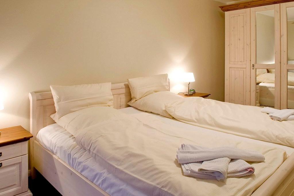Zum hochwertigen Interieur des Apartments gehören eine voll ausgestattete offene Küche mit Mikrowelle, Backofen, Toaster, Kaffeemaschine, Wasserkocher und Geschirrspüler ebenso wie eine TV-HiFi-Ausstattung mit DVD-Player im Wohnbereich. Dusche und WC sind separiert vom Bad; einen Föhn und einen Ganzkörperspiegel findet ihr ebenfalls in der Ferienwohnung vor. Ein zusätzliches Kinderbett gehört zur Wohnungsausstattung. Auf Wunsch könnt ihr einen Hochstuhl hinzubuchen.