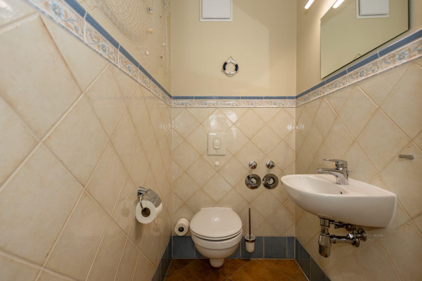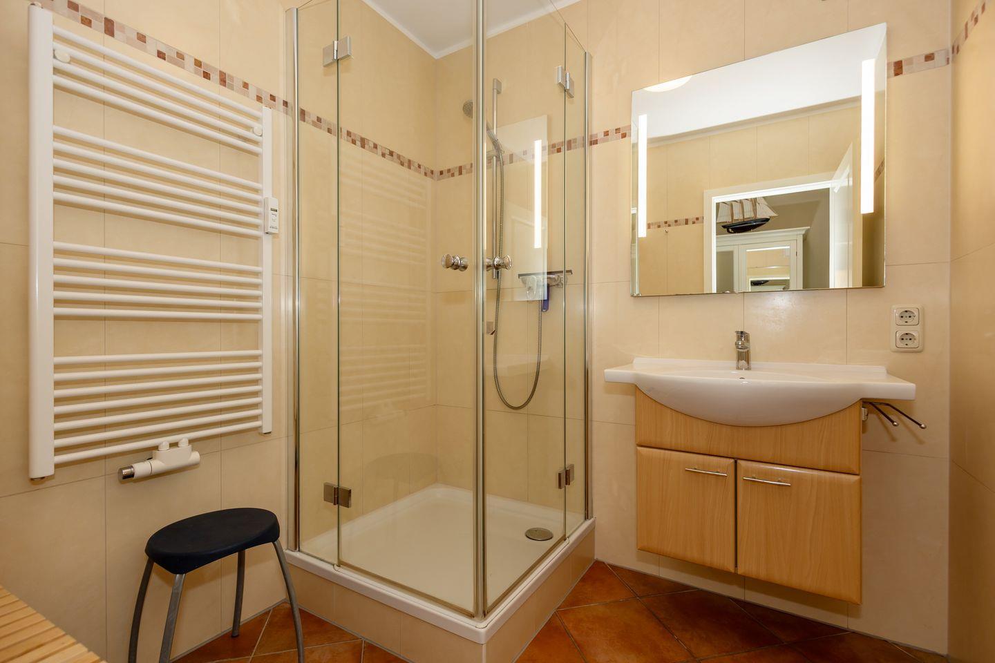 Das hochwertige Interieur der Ferienwohnung zeigt sich in einer voll ausgestatteten offenen Küche mit Backofen, Mikrowelle und Geschirrspüler. Auch Bügeleisen und Bügelbrett stehen euch zur Verfügung ebenso wie ein Fernseher und eine HiFi-Anlage. Dusche und WC sind separiert vom Bad, das euch auch einen Föhn bereitstellt. Vom westlich gelegenen Balkon aus genießt ihr einen seitliche Meerblick auf die nahe Ostsee.