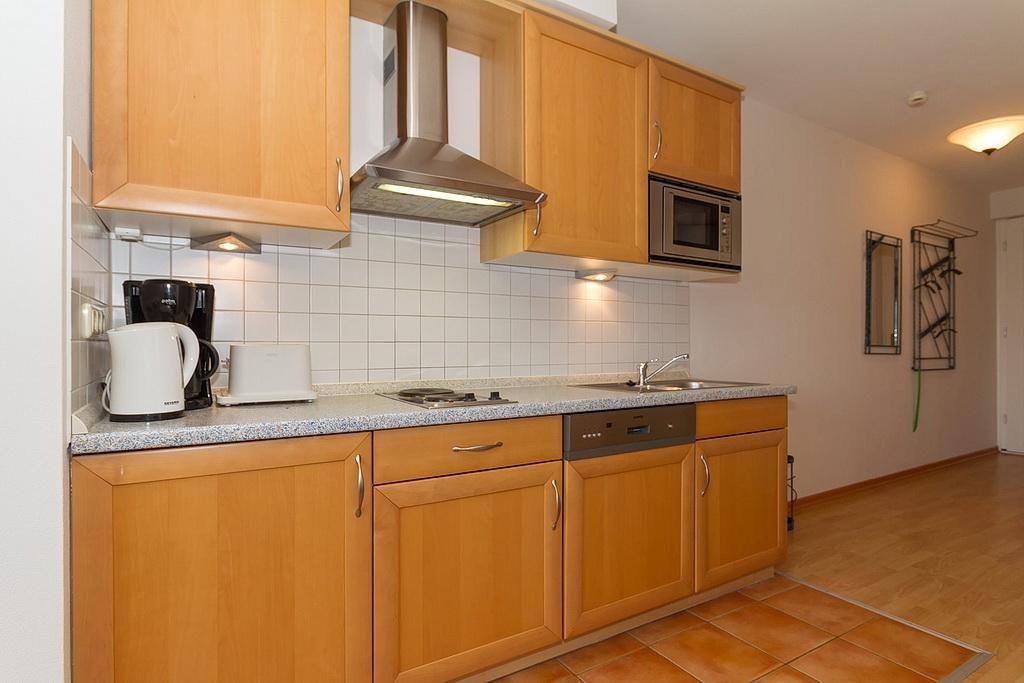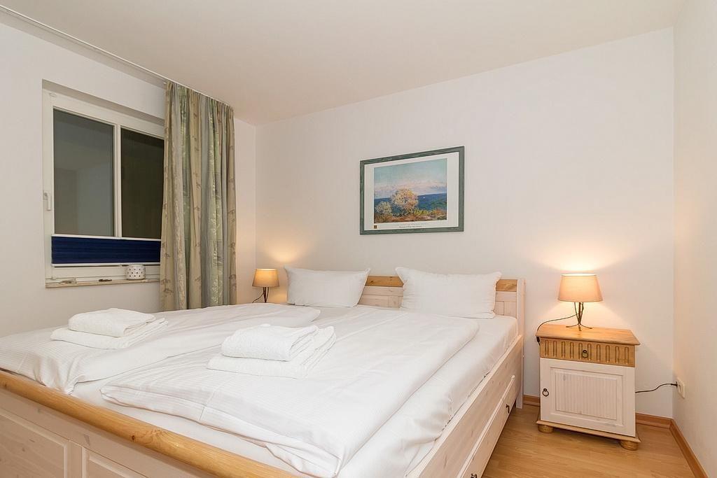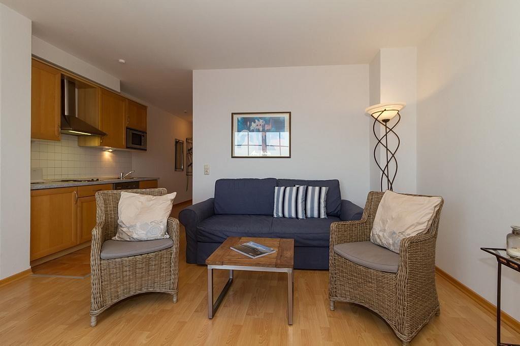 Das gemütliche Nichtraucher-Apartment verfügt über kostenfreies WLAN und eine voll ausgestattete offene Küche mit Geschirrspüler, Ceranfeld, Mikrowelle, Wasserkocher, Kaffeemaschine, Toaster und Tiefkühlfach. Der kombinierte Wohn- und Essbereich verfügt über eine TV-HiFi-Anlage mit Flachbild-TV, einen Minisafe und eine Doppelschlafcouch. Sowohl der Esstisch, als auch der behagliche Sitzbereich bieten genügend Platz, um schöne Stunden beim Frühstück oder nach einem ereignisreichen Tag am Strand zu verbringen. Das separate Schlafzimmer verfügt über ein großes Doppelbett (2 x 0,90 x 2,00). Das Schlafzimmerfenster liegt zum Atrium, dem begrünten, überdachten Innenhof des Gebäudes. Ein Kinderbett kann gegen Entgelt aufgestellt werden und auf Wunsch könnt ihr einen Hochstuhl hinzubuchen. Vom kleinen mit Balkonmöbeln ausgestatteten Balkon habt ihr einen uneingeschränkten Blick auf die Ostsee.