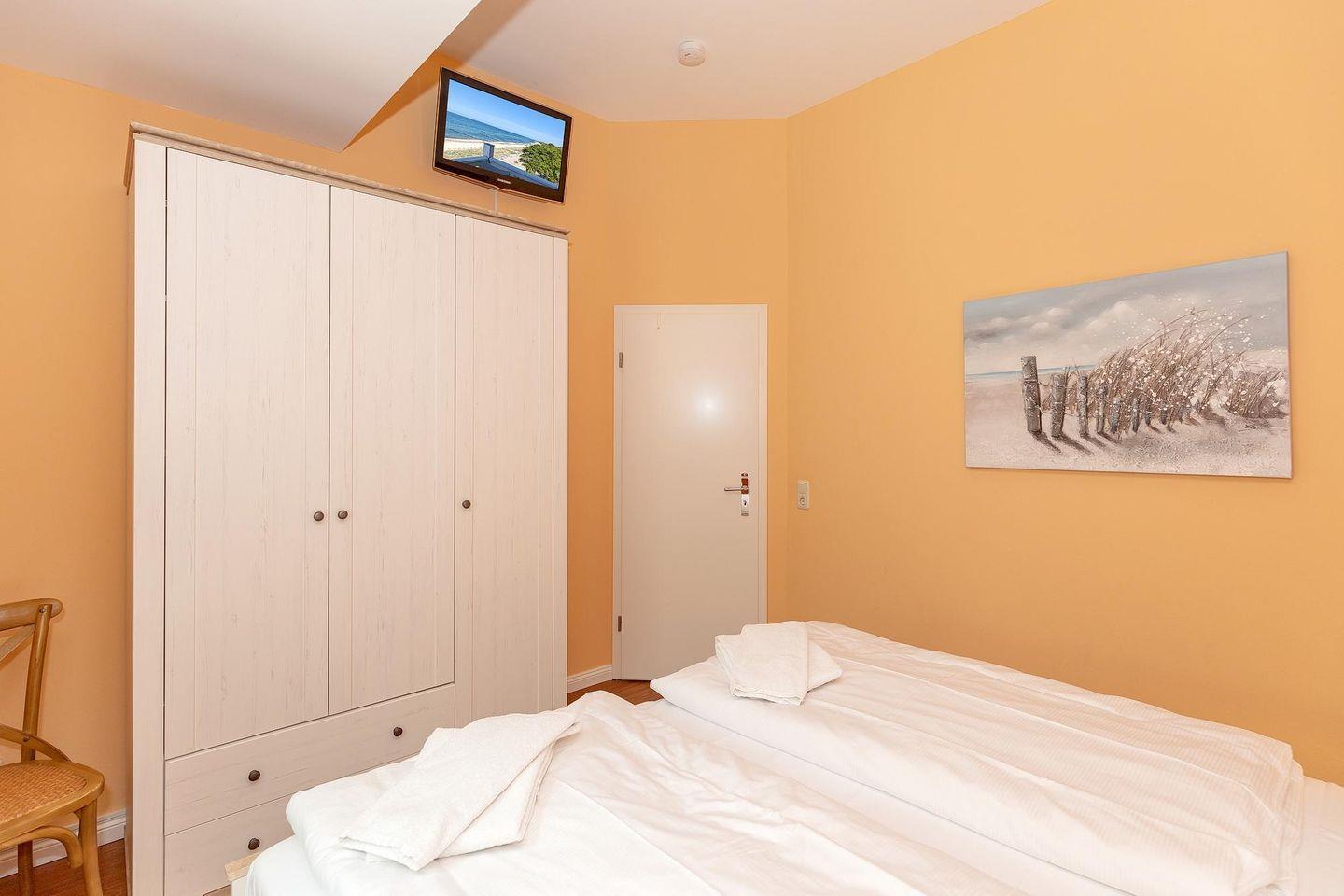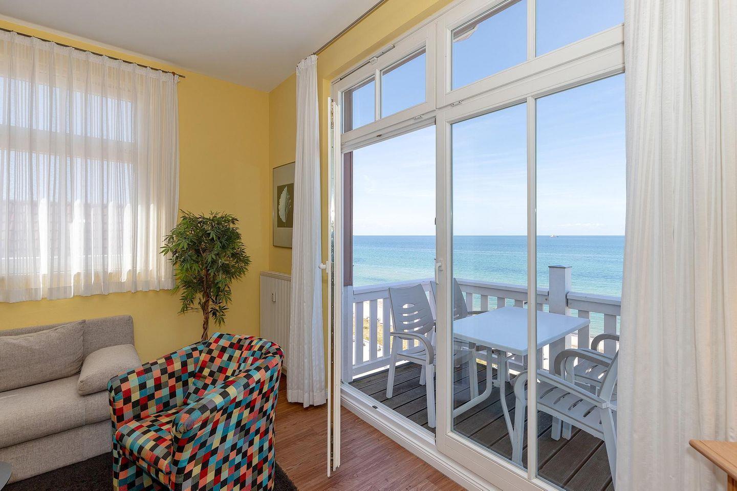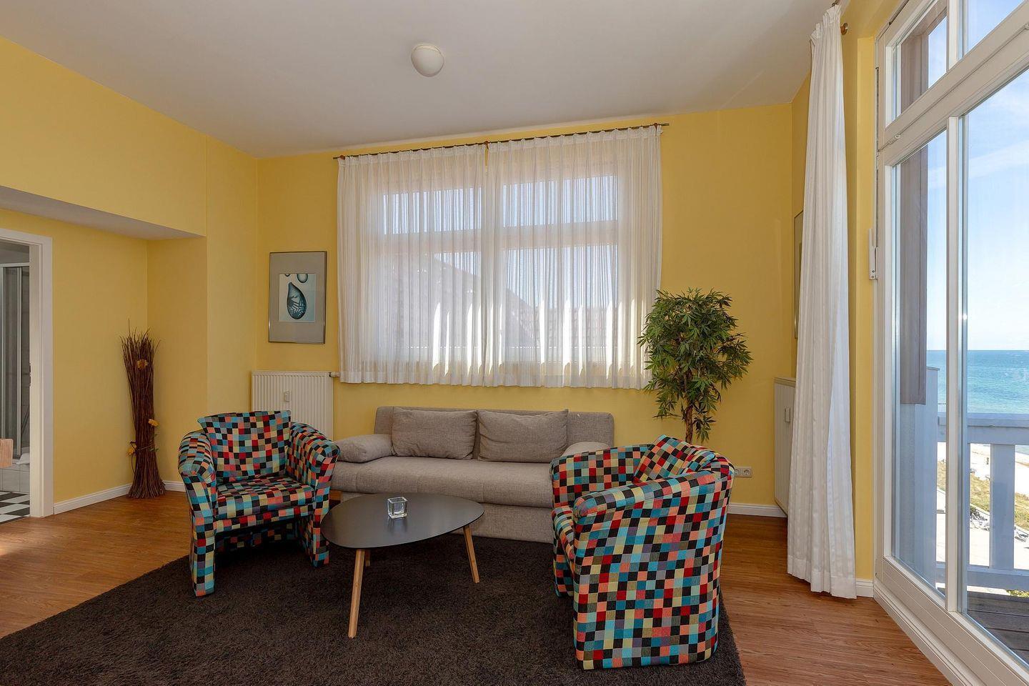Sowohl der Esstisch, als auch der behagliche Sitzbereich bieten genügend Platz, um schöne Stunden beim Frühstück oder auch nach einem ereignisreichen Tag am Strand zu verbringen. Die Wohnung verfügt über zwei separate Badezimmer jeweils mit Dusche, WC, Waschbecken und Föhn. Im Dachzimmer befindet sich eine eine gemütliche Sitzecke mit Sesseln und einem Sofa. Überdies bietet die charmante Turmwohnung zwei separate Schlafzimmer. Eines ist mit einem großen Doppelbett (2 x 0,90 m x 2,00 m) und eigenem Flatscreen-TV ausgestattet; das Schlafzimmerfenster liegt hier zum Atrium, dem begrünten, überdachten Innenhof des Gebäudes. Das zweite Schlafzimmer verfügt über zwei Einzelbetten (0,90 m x 2,00 m) und befindet sich auf der zweiten Wohnebene. Ein Kinderbett kann gegen Entgelt aufgestellt werden und auf Wunsch könnt ihr einen Hochstuhl hinzubuchen. Vom mit Balkonmöbeln ausgestatteten Balkon habt ihr einen herrlichen Blick auf die Ostsee. Während der Saison, von Mai bis September, steht euch exklusiv ein Strandkorb am Strand zur kostenfreien Nutzung zur Verfügung!