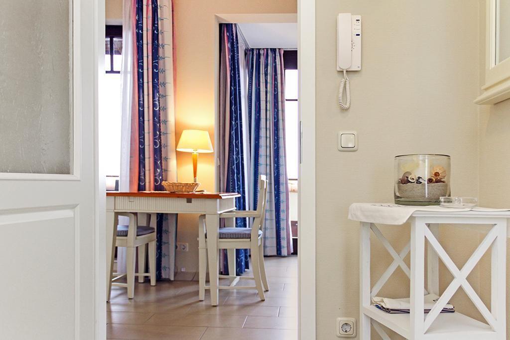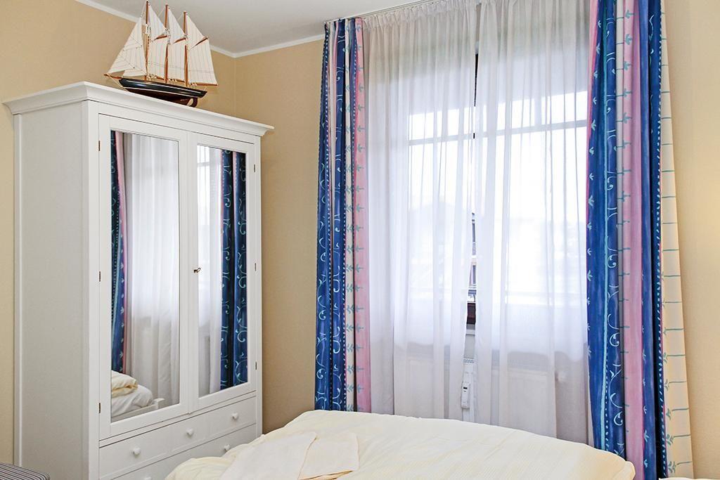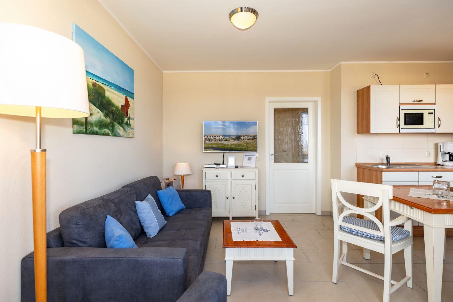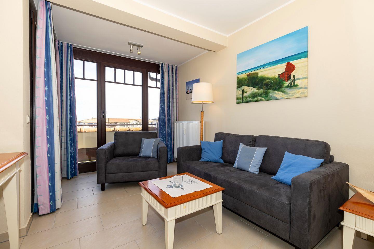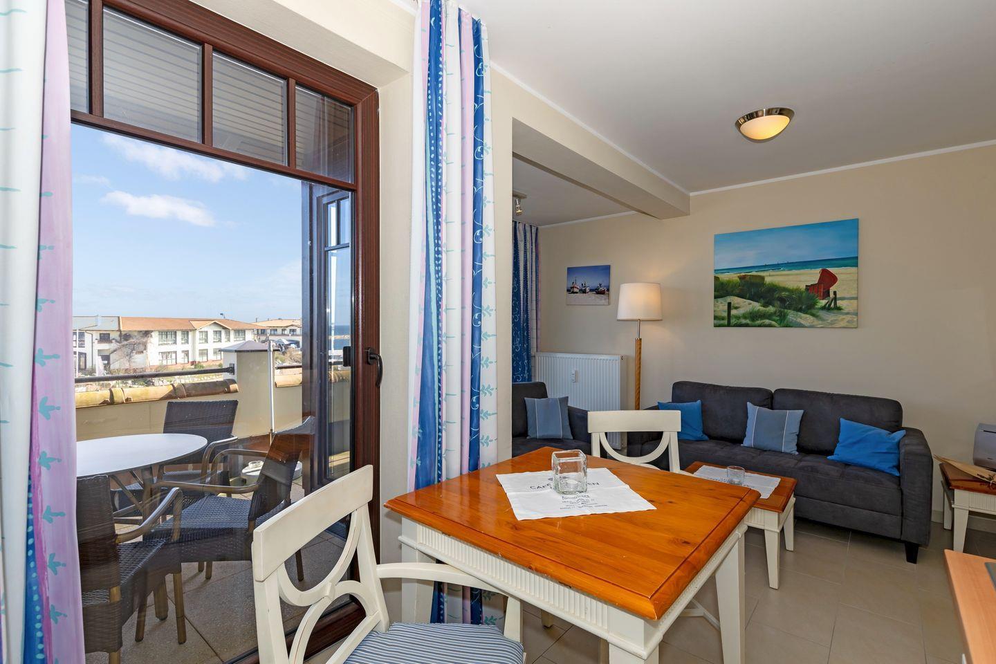 Die Ferienwohnung verfügt über ein Schlafzimmer mit Doppelbett, über einen Wohnbereich und einen überdachten Balkon mit Meerblick Richtung Nord-Ost.