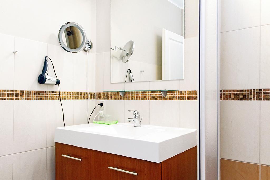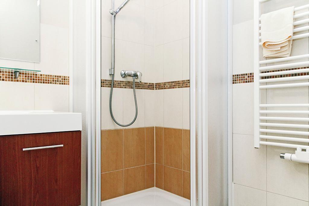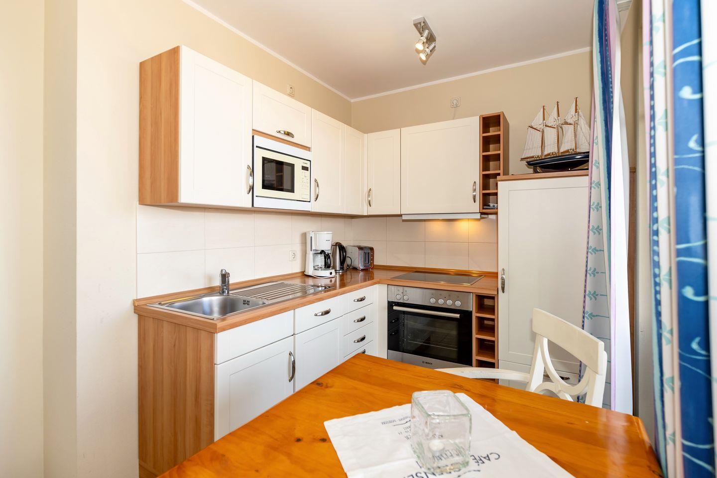 Backofen, Mikrowelle und Geschirrspüler gehören zur voll ausgestatteten offenen Küche; ein Föhn und eine TV-HiFi-Anlage mit DVD-Player komplettieren das Interieur der Ferienwohnung, die über eine separate Dusche und ein separates WC verfügt.