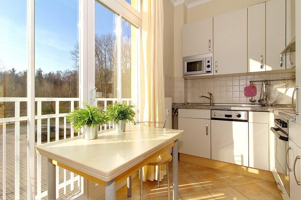 Zudem gehören zur Ferienwohnung eine kleine, voll ausgestattete separate Küche mit Ausblick zum Wald. Die Küchenausstattung beinhaltet Wasserkocher, Kaffeemaschine, Toaster, Backofen, Geschirrspüler, Mikrowelle und Eierkocher. Des Weiteren verfügt das Apartment über Mini-Safe, Föhn, Bügeleisen, Bügelbrett, TV-HiFi-Anlage, drei Flachbild-TV-Geräte und einen DVD-Player. Der WLAN-Anschluss ist kostenfrei.