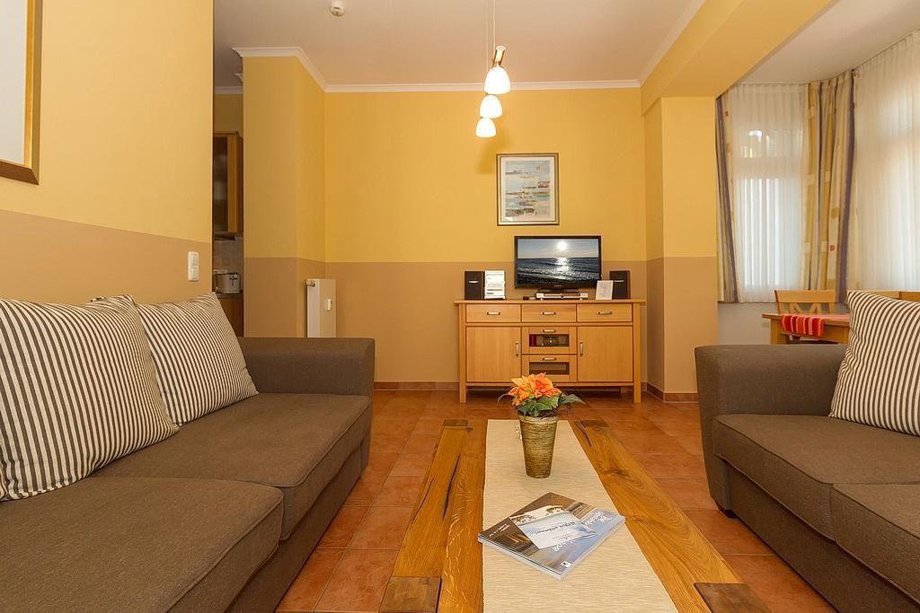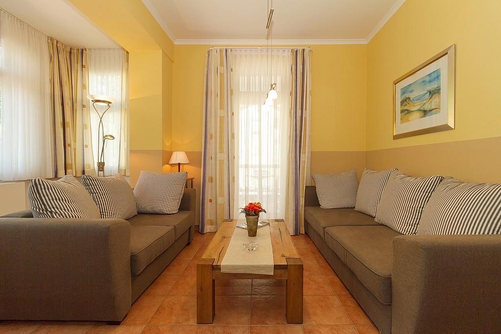 Das Apartment verfügt über ein Schlafzimmer mit Doppelbett (2 x 90 x 2,00 m), ein Schlafzimmer mit Einzelbett (1 x 90 x 2,00 m), einen Wohnbereich mit Schlafcouch (1,40 m x 1,90 m) und ansprechender Fensterfront, ein Badezimmer mit Badewanne und über einen Balkon zur Meerseite.