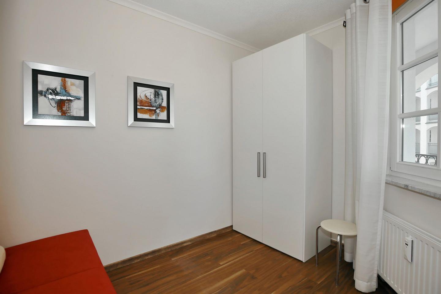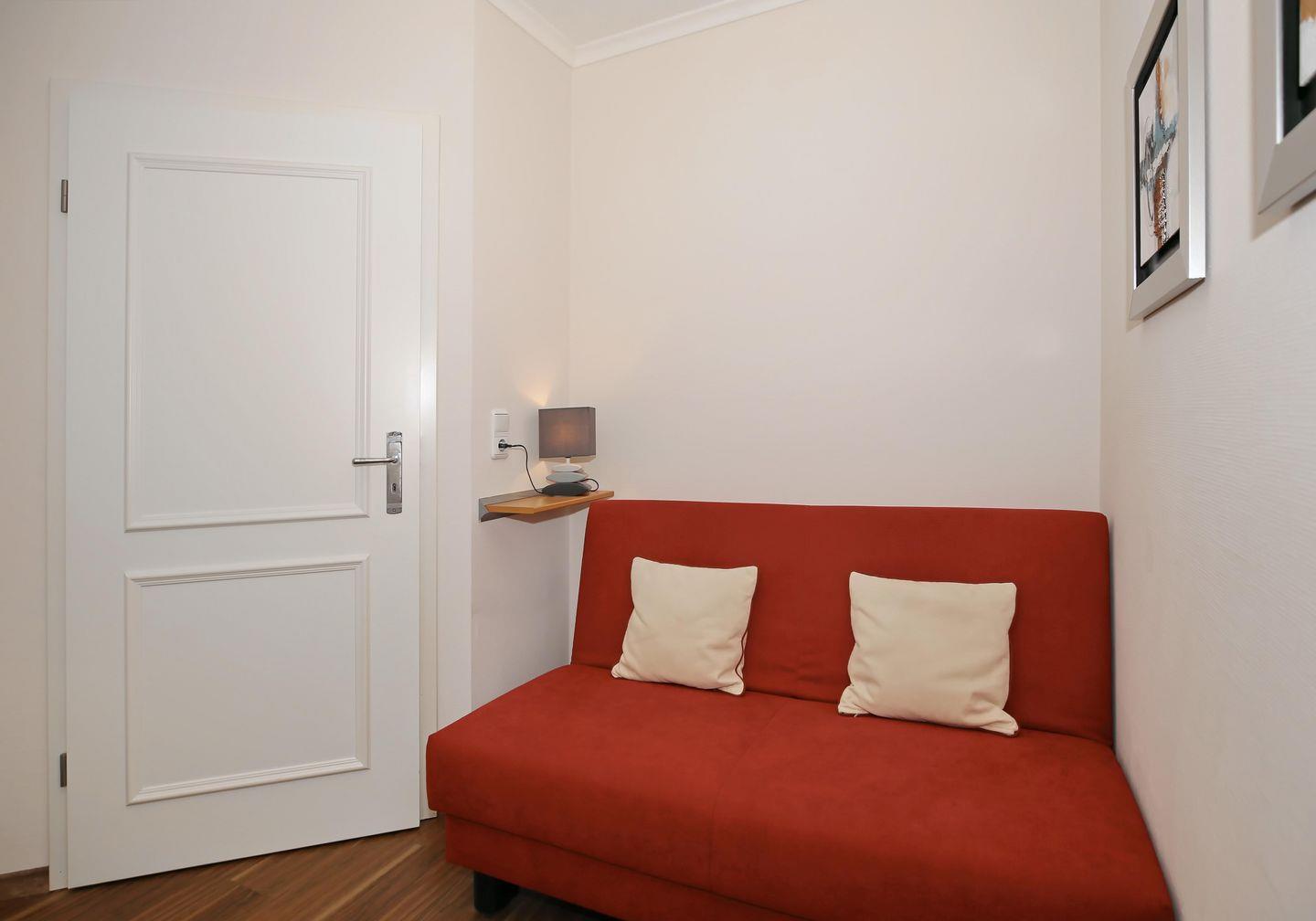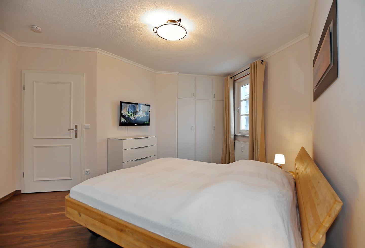Im ersten Schlafzimmer der Ferienwohnung verspricht dir ein komfortables Doppelbett (2 x 90 x 200 cm) eine erholsame Nachtruhe. Ein großer Kleiderschrank bietet dir viel Stauraum für dein Urlaubsgepäck. Ein Flachbild-TV sorgt auch hier für abendliche Unterhaltung. Das zweite Schlafzimmer ist mit einer Schlafcouch (148 x 195 cm) ausgestattet. Auch hier bietet dir ein Kleiderschrank Stauraum. Die Schlafcouch (160 x 200 cm) im Wohnbereich wird schnell zu einem bequemen Schlafplatz für 2 Personen. In beiden Schlafzimmern sowie im Wohnbereich sind Vorhänge und Rollos als Sichtschutz oder zum Verdunkeln angebracht.