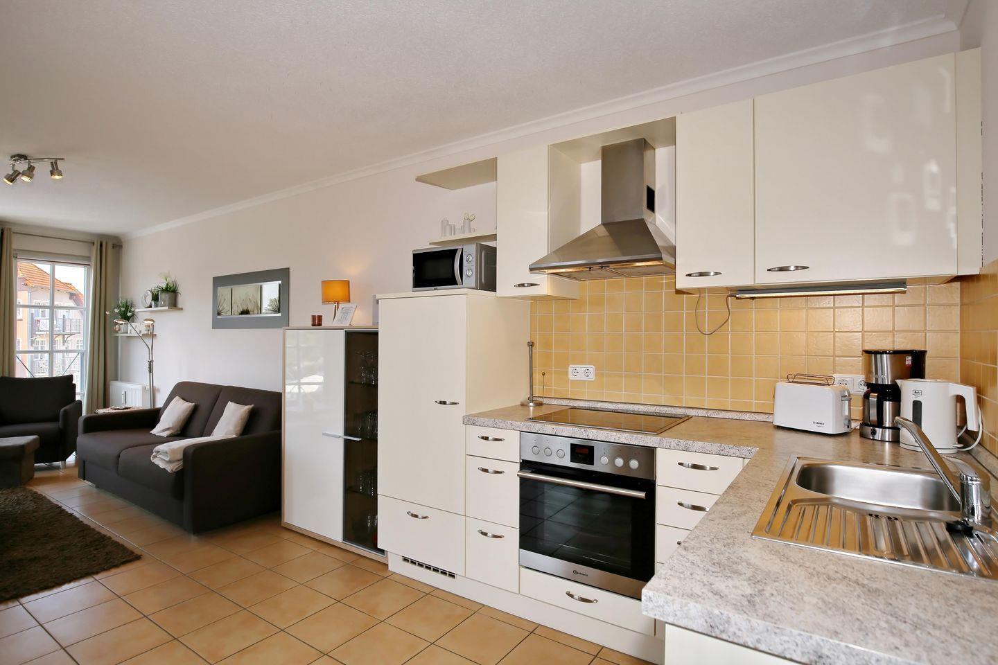 Die moderne Küchenzeile ist voll ausgestattet. Ein Kühlschrank mit Gefrierfach, ein Geschirrspüler, ein Backofen mit einem 4-Platten-Cerankochfeld, eine Mikrowelle, ein Toaster sowie eine Kaffeemaschine und ein Wasserkocher gehören zur Kücheneinrichtung.