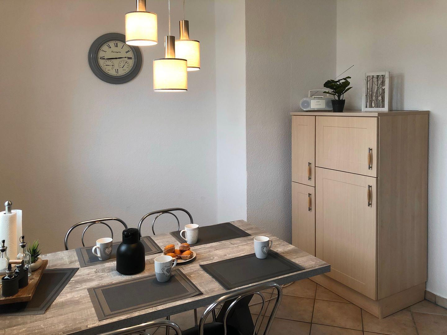 Der Küchenbereich der Ferienwohnung ist für dich mit einem Geschirrspüler, einem Kühlschrank mit Gefrierfach, einem Herd mit Backofen und einem 4-Platten-Cerankochfeld ausgestattet. Ein Wasserkocher, eine Kaffeemaschine und ein Toaster vervollständigen die Kücheneinrichtung.