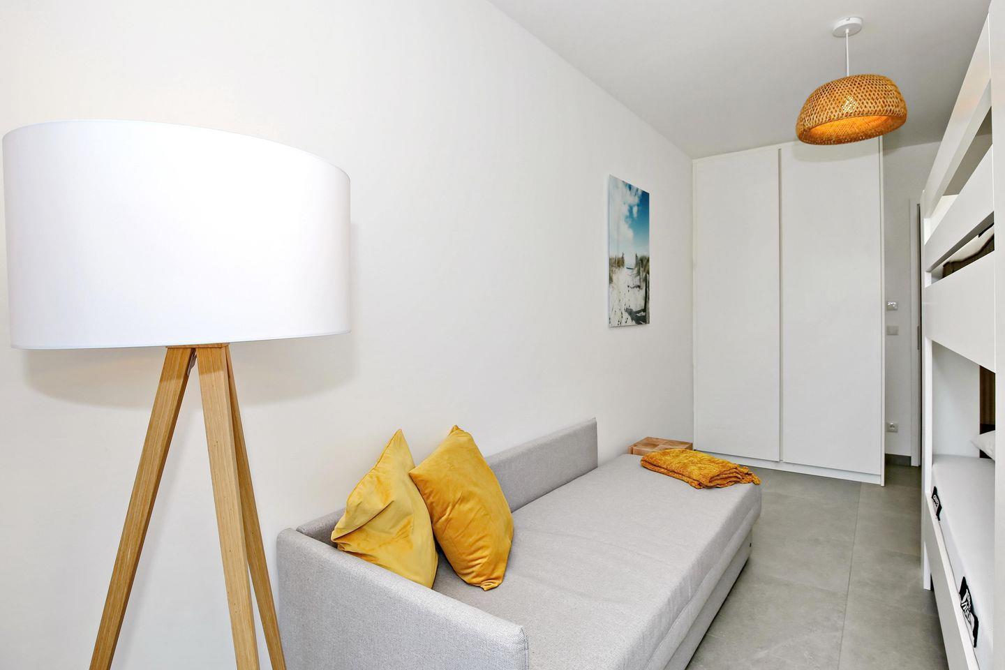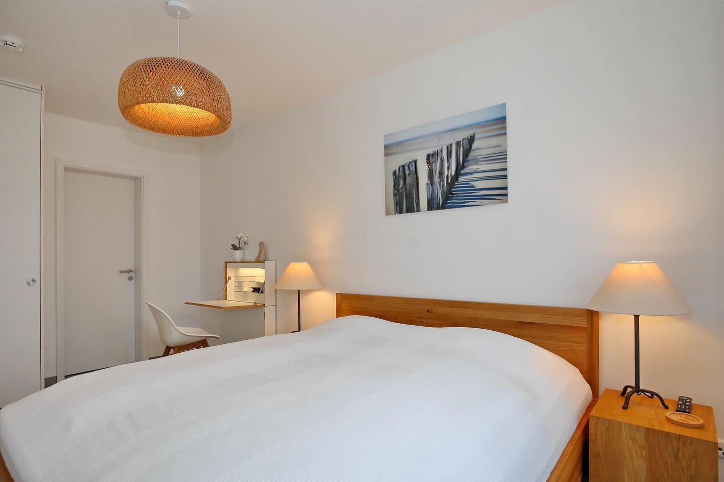 Im ersten Schlafzimmer der Ferienwohnung empfängt dich ein bequemes Vollholz-Doppelbett der Marke Team7 (180 x 200 cm) zur erholsamen Nachtruhe. Für besonderen Komfort haben die Matratzen die Härtegrade H2 und H3. Ein Kleiderschrank bietet dir genügend Stauraum für dein Urlaubsgepäck. Ein Flachbild-TV sorgt für spätabendliche Unterhaltung. Das zweite Schlafzimmer ist ebenso mit einem Etagenbett mit Koje (2 x 100 cm x 200 cm), einem Kleiderschrank und einer Schlafcouch (80 x 200 cm) für eine weitere Person eingerichtet.