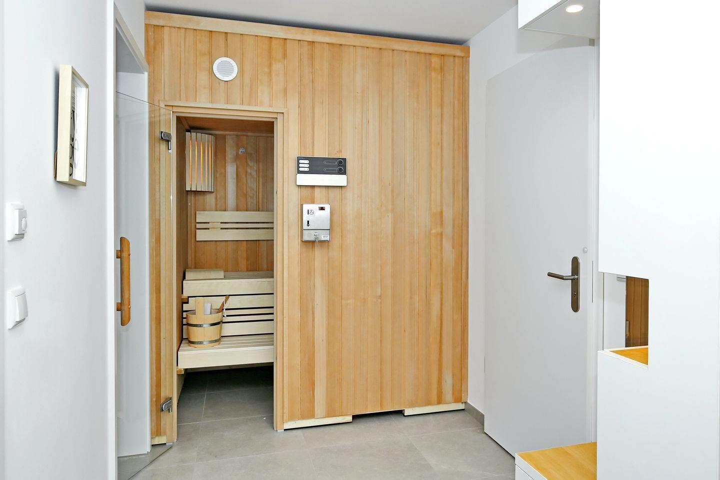 Die beiden Bäder sind modern gestaltet und verfügen jeweils über eine ebenerdige Dusche, ein WC, beleuchtete Spiegel und Kosmetikspiegel sowie einen Föhn. In einem der Bäder befindet sich ein Kombinationsgerät aus Waschmaschine und Trockner. Die Sauna ist in den Flur integriert und wird durch Münzeinwurf (30 Minuten kosten 1,00 €) betrieben.