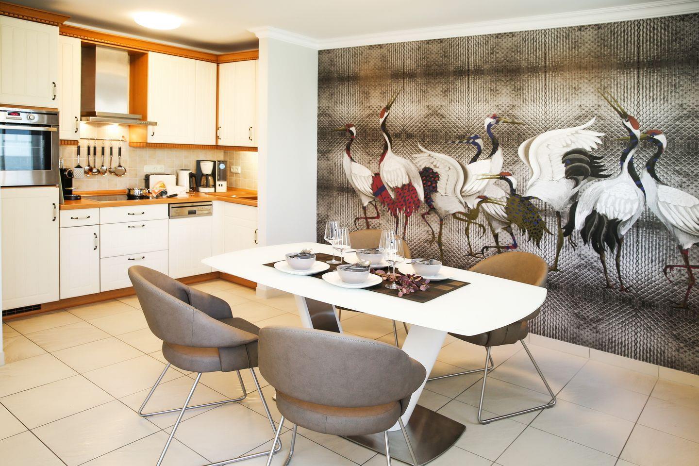 Die moderne Küchenzeile ist im Wohnzimmer integriert und beinhaltet 4 Cerankochfelder, einen Kühlschrank, einen Backofen, einen Geschirrspüler sowie einen Toaster, eine Kaffeemaschine und einen Wasserkocher. Der Esstisch bietet dir reichlich Platz für deine Mahlzeiten oder Spieleabende.