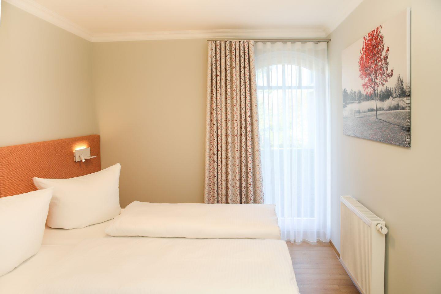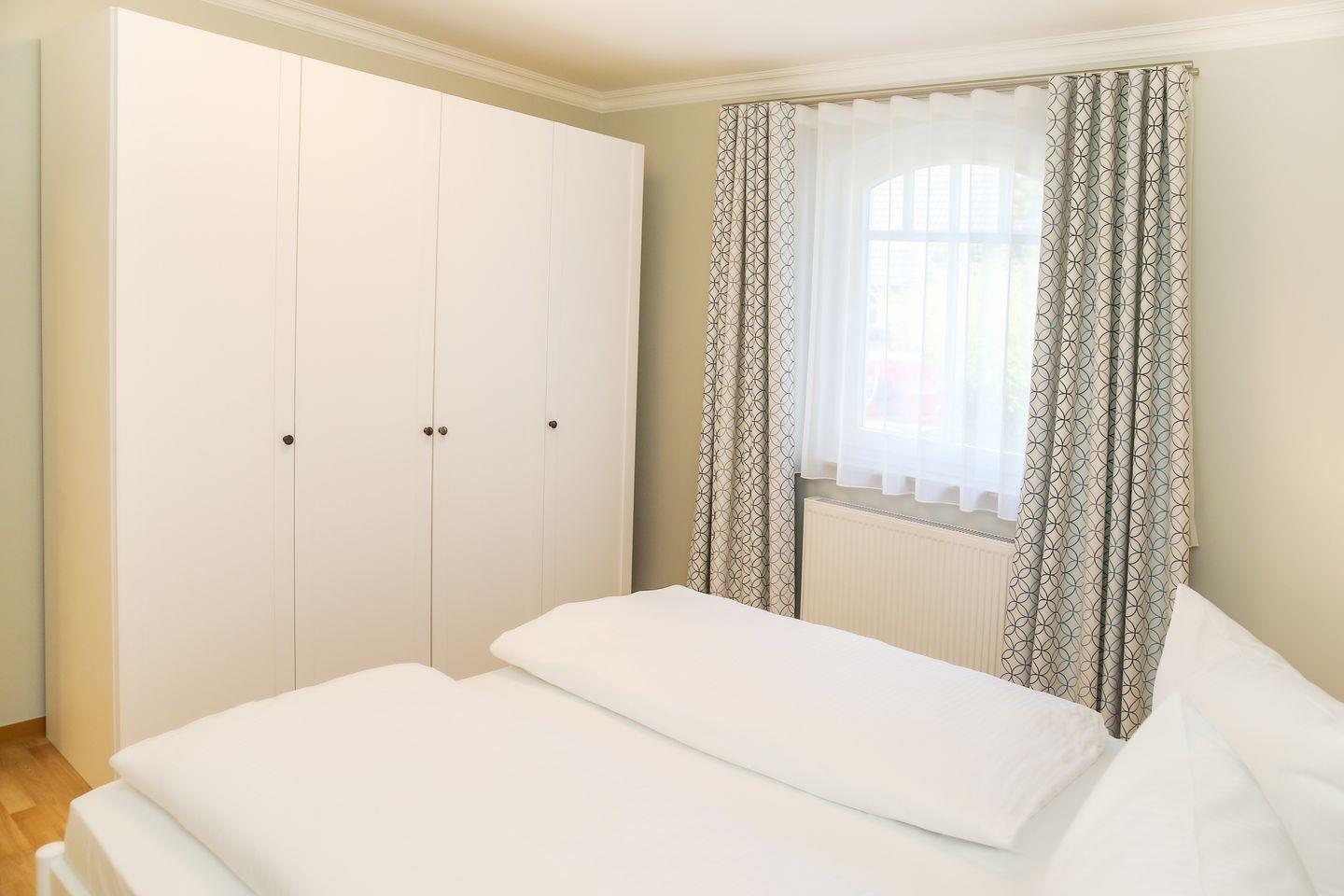 Die Ferienwohnung ist im 1. Schlafzimmer mit einem bequemen Doppelbett (180 x 200) ausgestattet. Im 2. Schlafzimmer befinden sich zwei Einzelbetten (80 x 200), die du bequem zu einem Doppelbett zusammenschieben kannst.