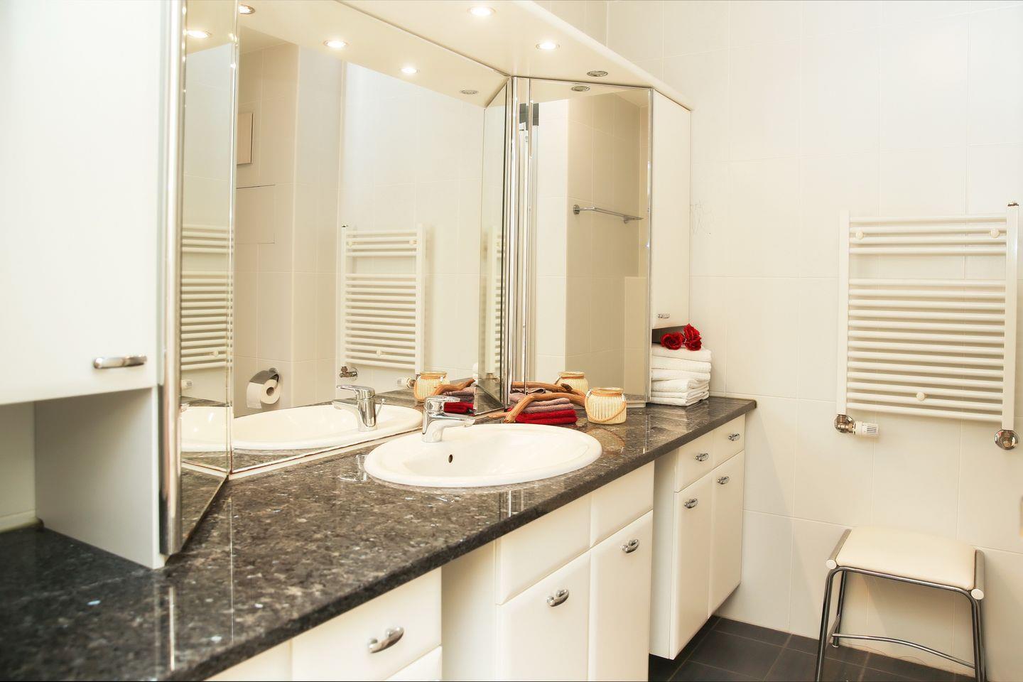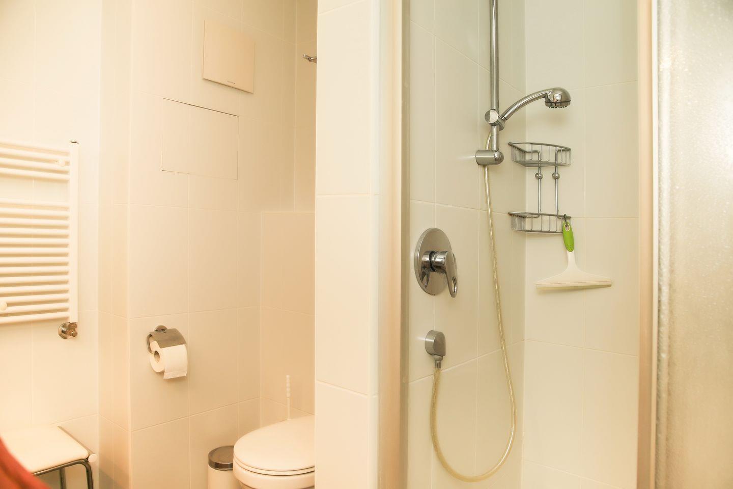 Das Duschbad/WC ist mit einem großen Waschtisch, einer Dusche sowie Ablagemöglichkeiten versehen.