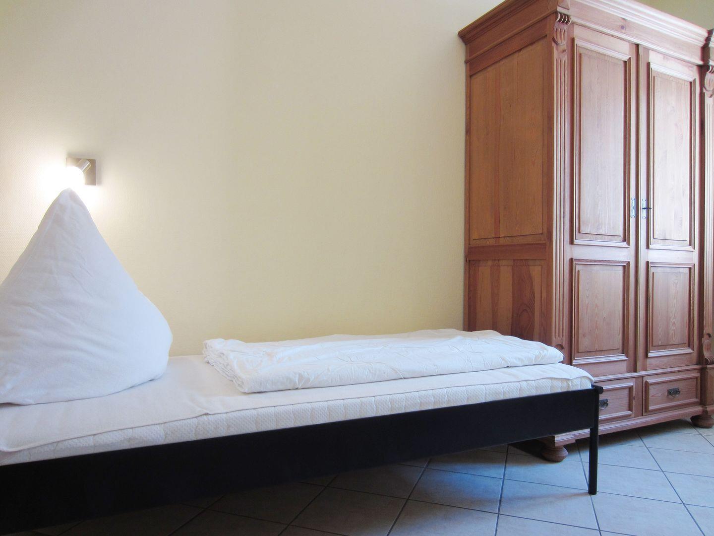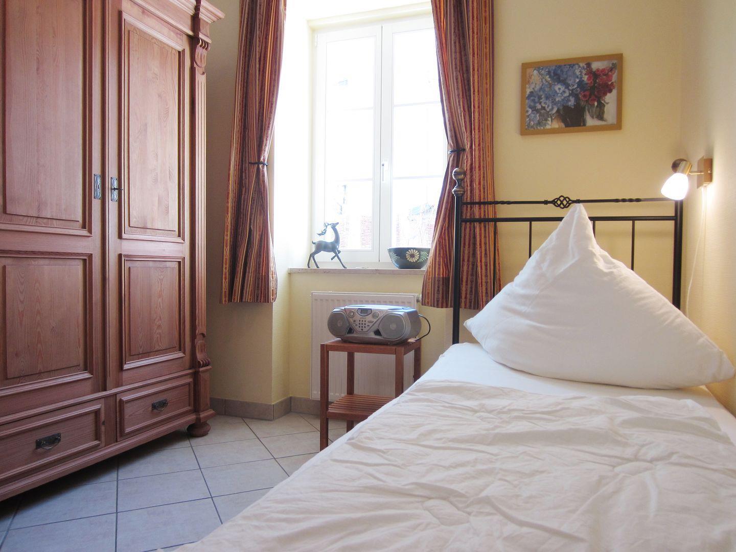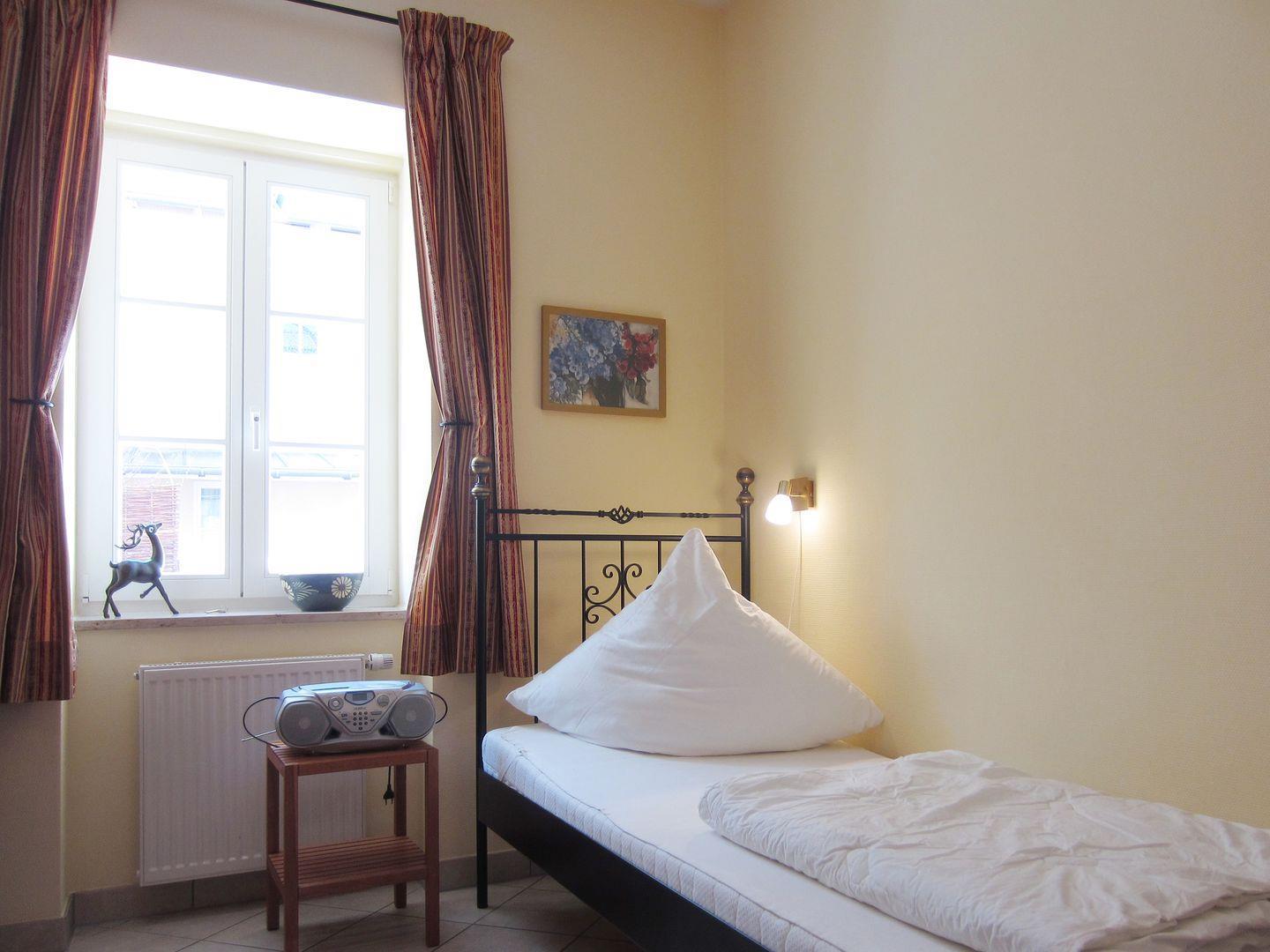 Zwei Einzelbetten befinden sich im zweiten Schlafzimmer, sowie ein 2. Kleiderschrank. Für die ganz Kleinen gibt es ebenfalls ein Kinderreisebett und einen Kinderhochstuhl.