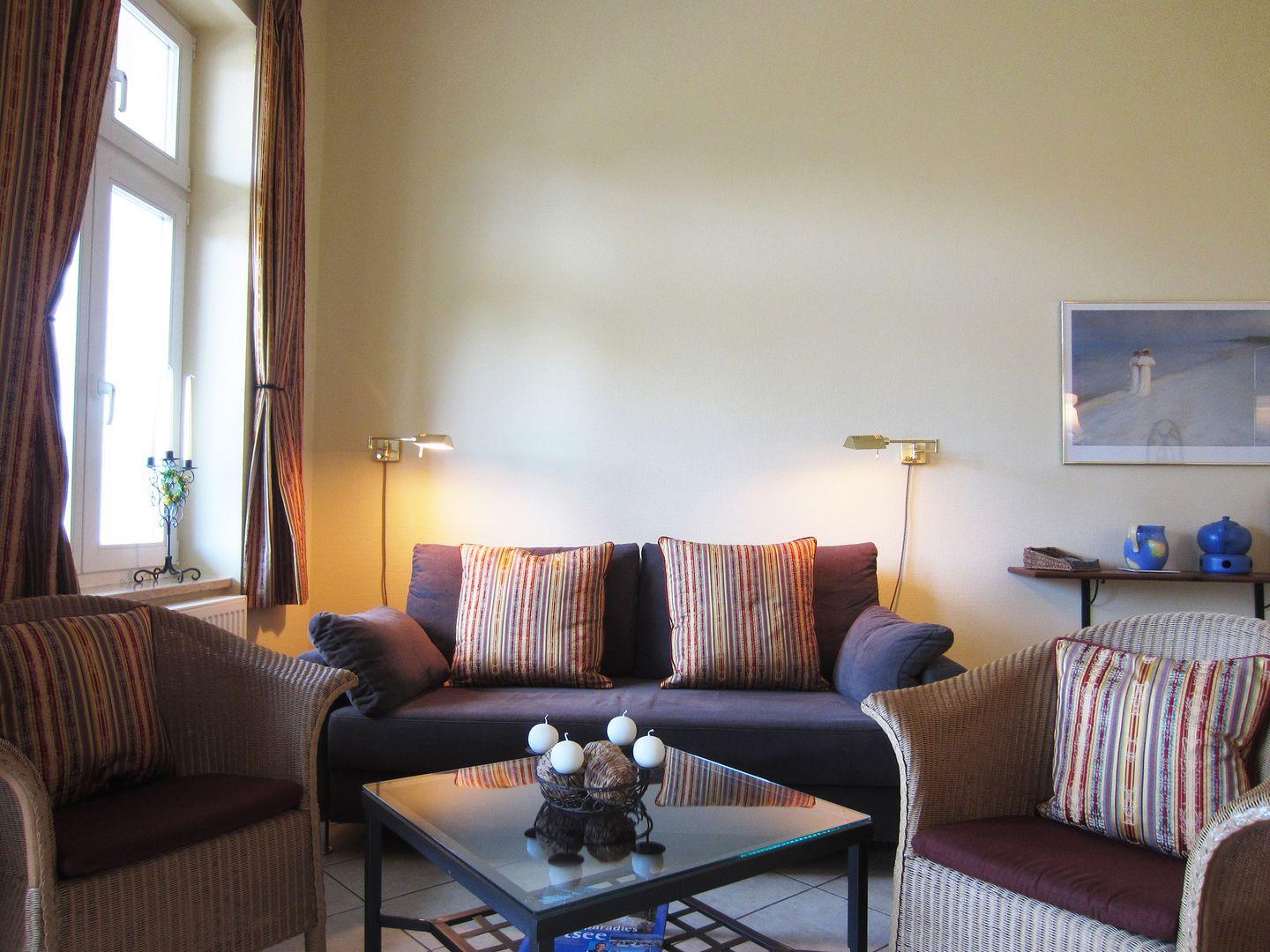 Die Ferienwohnung überzeugt durch ihre Lage, Größe und Ausstattung. Ebenerdig gelegen, im Vorderhaus "Villa Seeadler", befinden sich auf 70 m² zwei geräumige Schlafzimmer, ein neu renoviertes Duschbad mit ebenerdiger Dusche, ein Wohnzimmer mit Zugang zur Loggia nach Osten zum Lindenpark und eine vollausgestattete Küche.