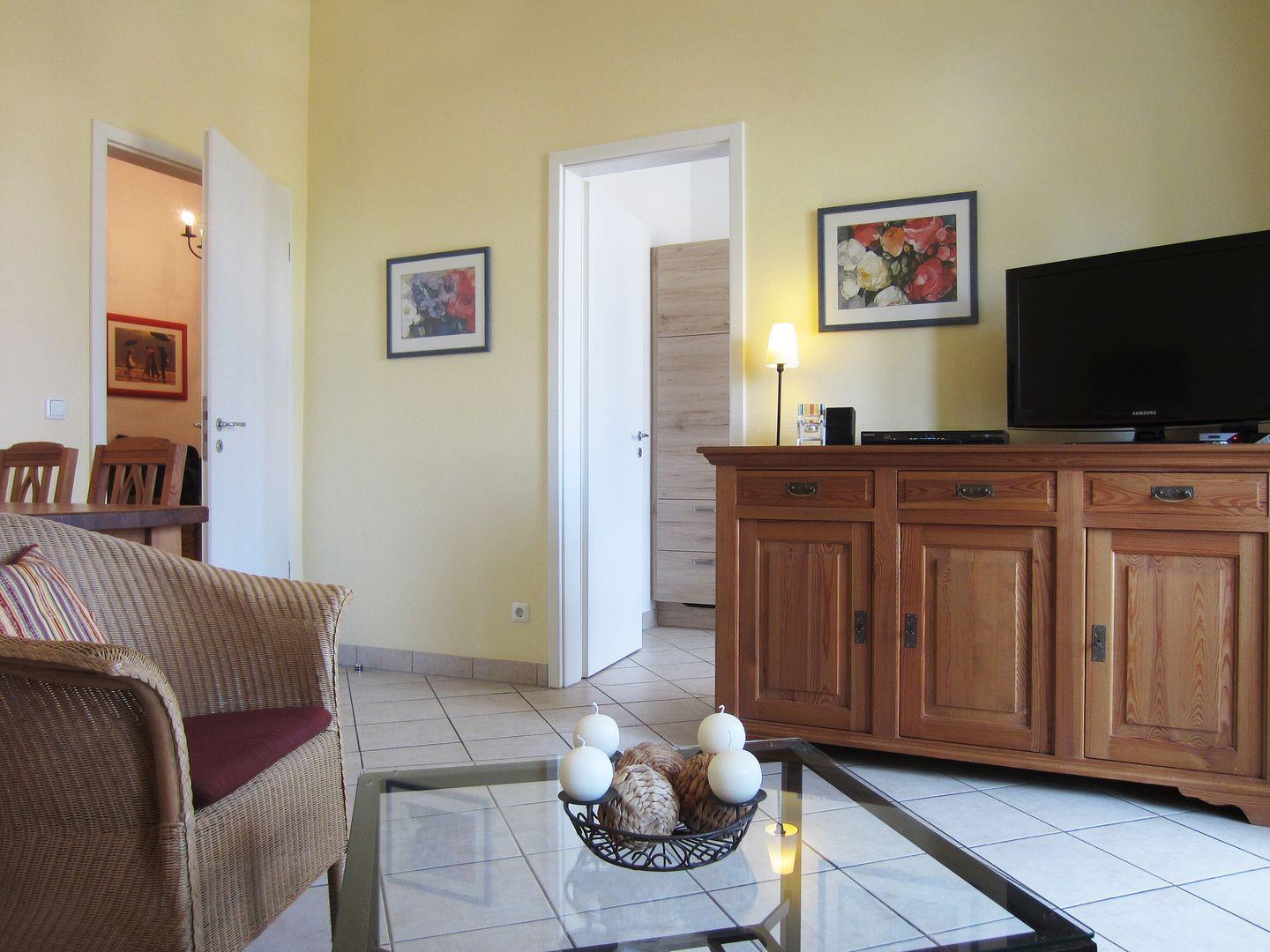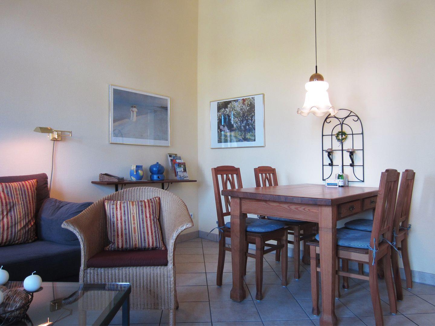 Im Wohnzimmer befindet sich ebenfalls ein gemütlicher Essbereich, sowie ein bequemes Sofa, zwei Sessel und ein TV mit Blue Ray und DVD Player.