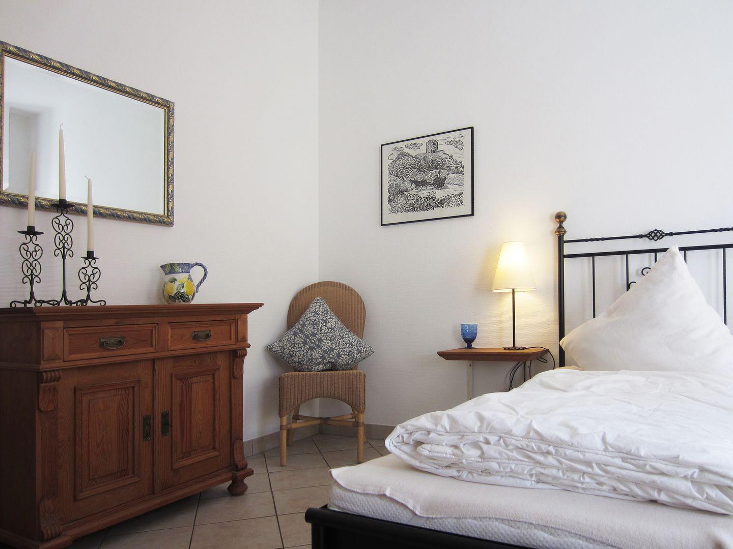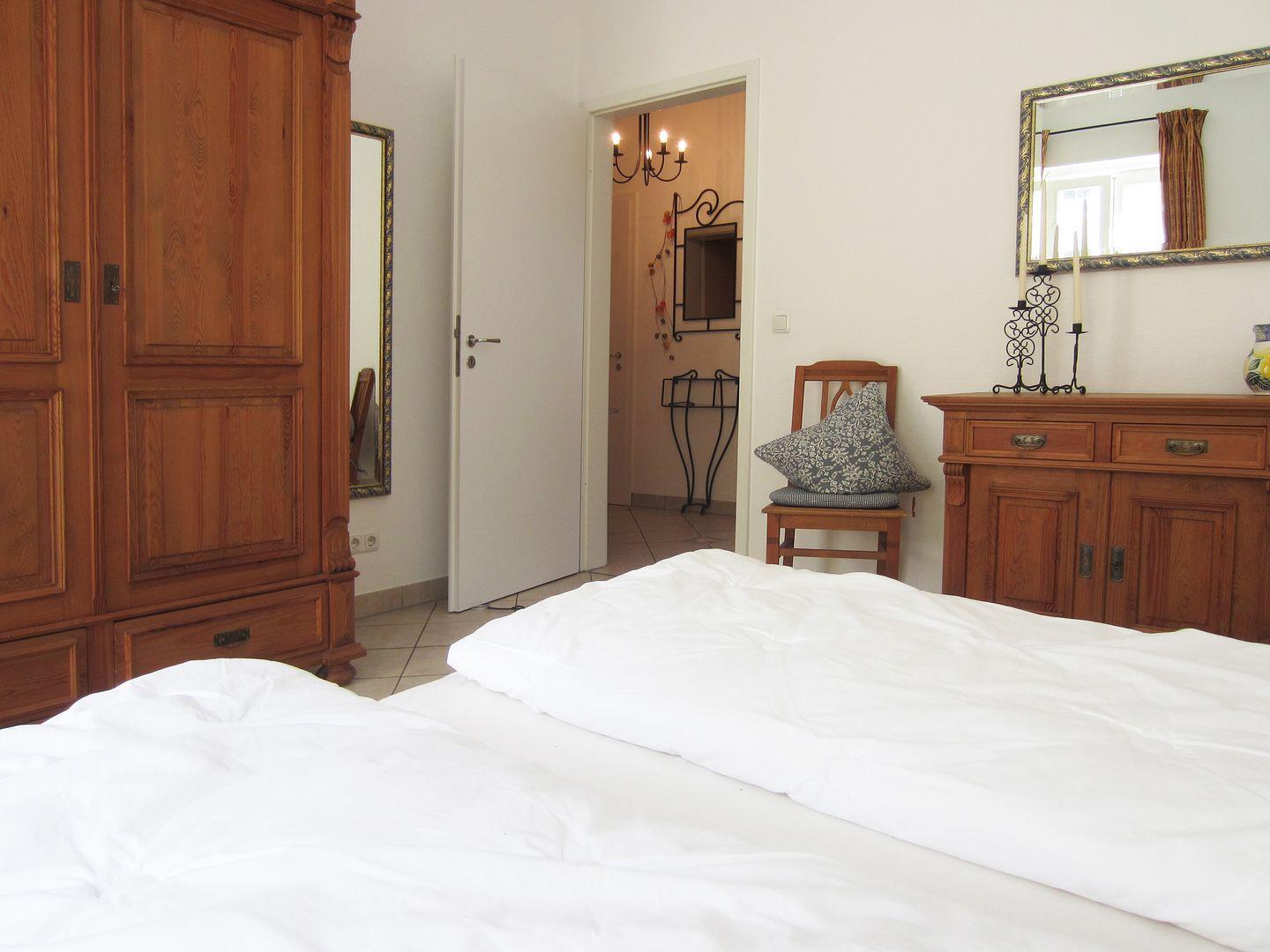 Im großen Hauptschlafzimmer ist der Zugang zur Terrasse zum ruhigen Innenhof. Es gibt ein Doppelbett, einen 2. TV und einen großen Kleiderschrank, wo ihre Urlaubsgardrobe sicher genug Platz hat.