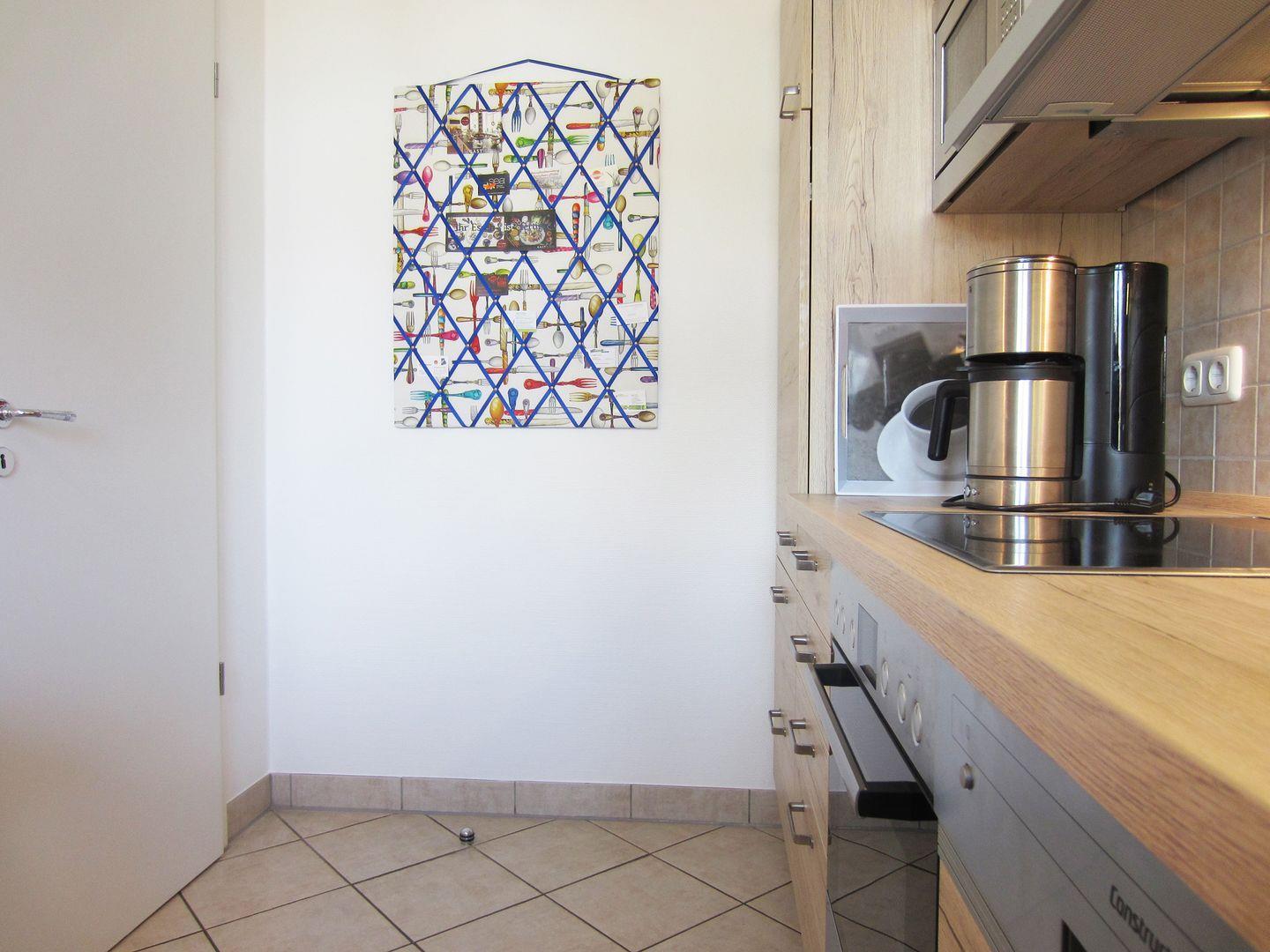 Die Küche verfügt über einen großen Kühlschrank mit Gefrierfach, einem 4er Ceranfeld und Backofen. Kaffeemaschine, Wasserkocher und Toaster sind ebenfalls vorhanden.