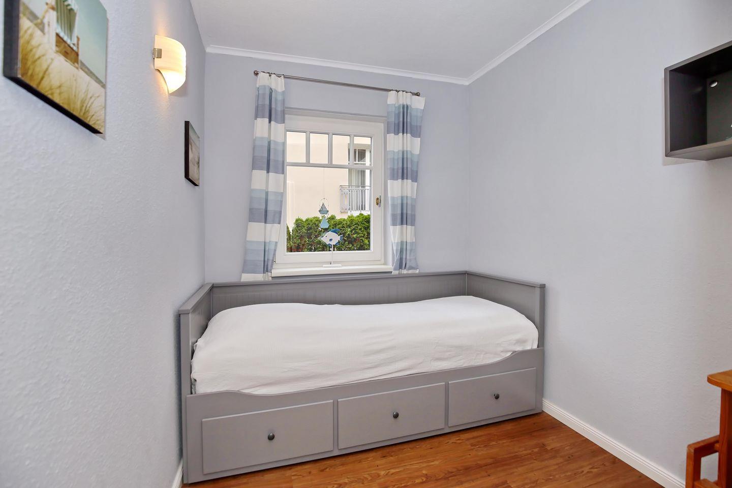 Die modern ausgestattete Ferienwohnung hat eine Größe von 43 m² und befindet sich im Hochparterre des Hauses. In der Wohnung kannst du zu jeder Jahreszeit einen gemütlichen Urlaub verbringen. Es erwarten dich ein Wohn-/Essbereich, zwei Schlafzimmer und ein Duschbad. Der Balkon mit West-Ausrichtung lädt zum Verweilen an der frischen Luft ein. Zum Strand sind es ca. 50 m.