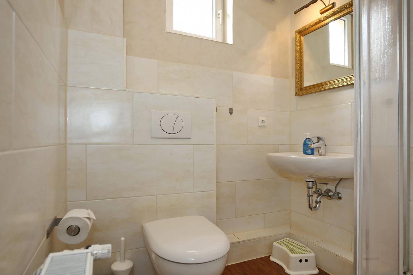 Selbstverständlich gehört ein Badezimmer zur Wohnung. Das Bad ist mit einer Dusche, einem WC, einem Waschbecken und einem Spiegel ausgestattet. Fliesen wurden sowohl im Bad als auch in der Küche verlegt. Die restliche Ferienwohnung verfügt über einen hochwertigen Vinylboden.