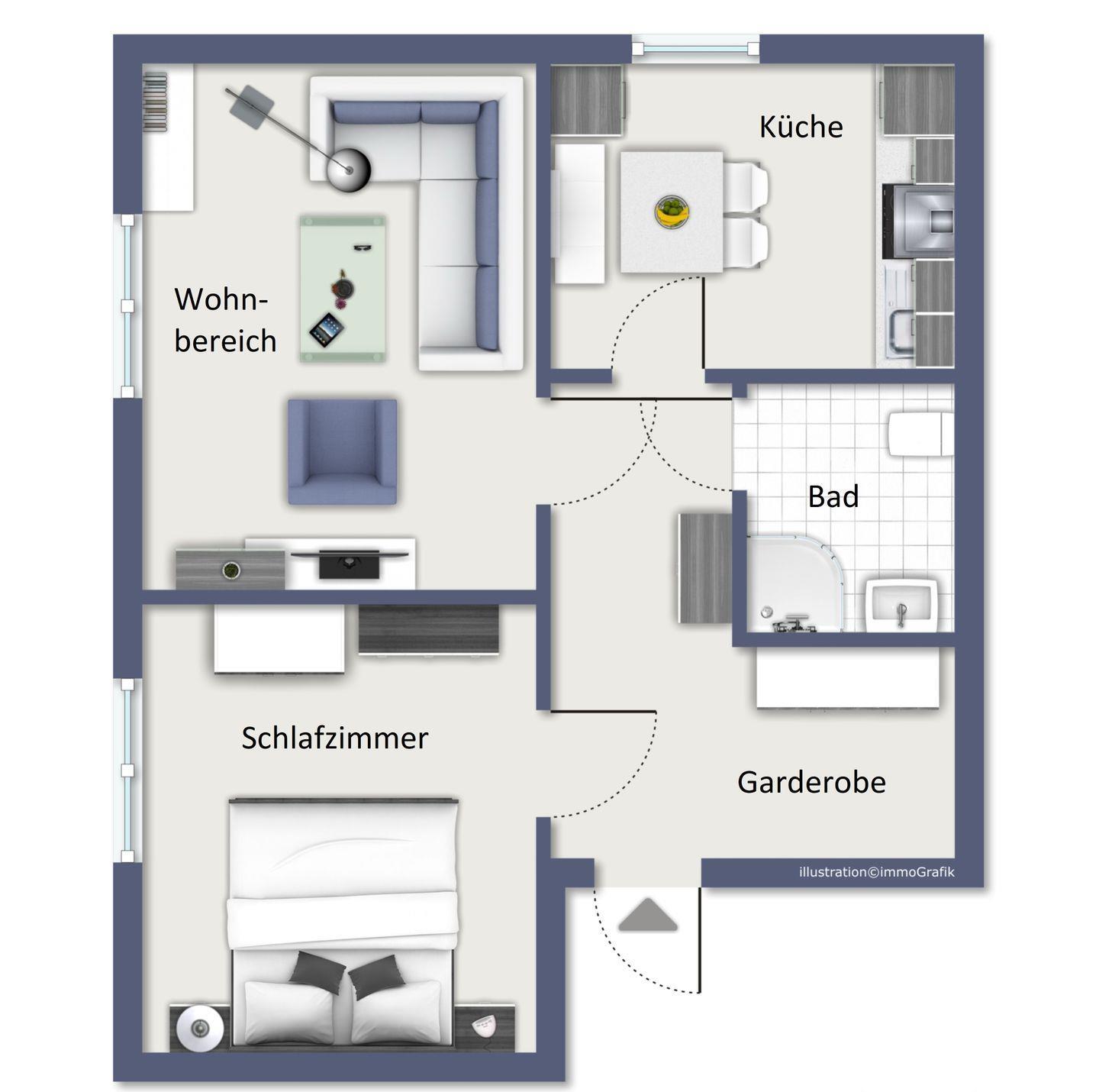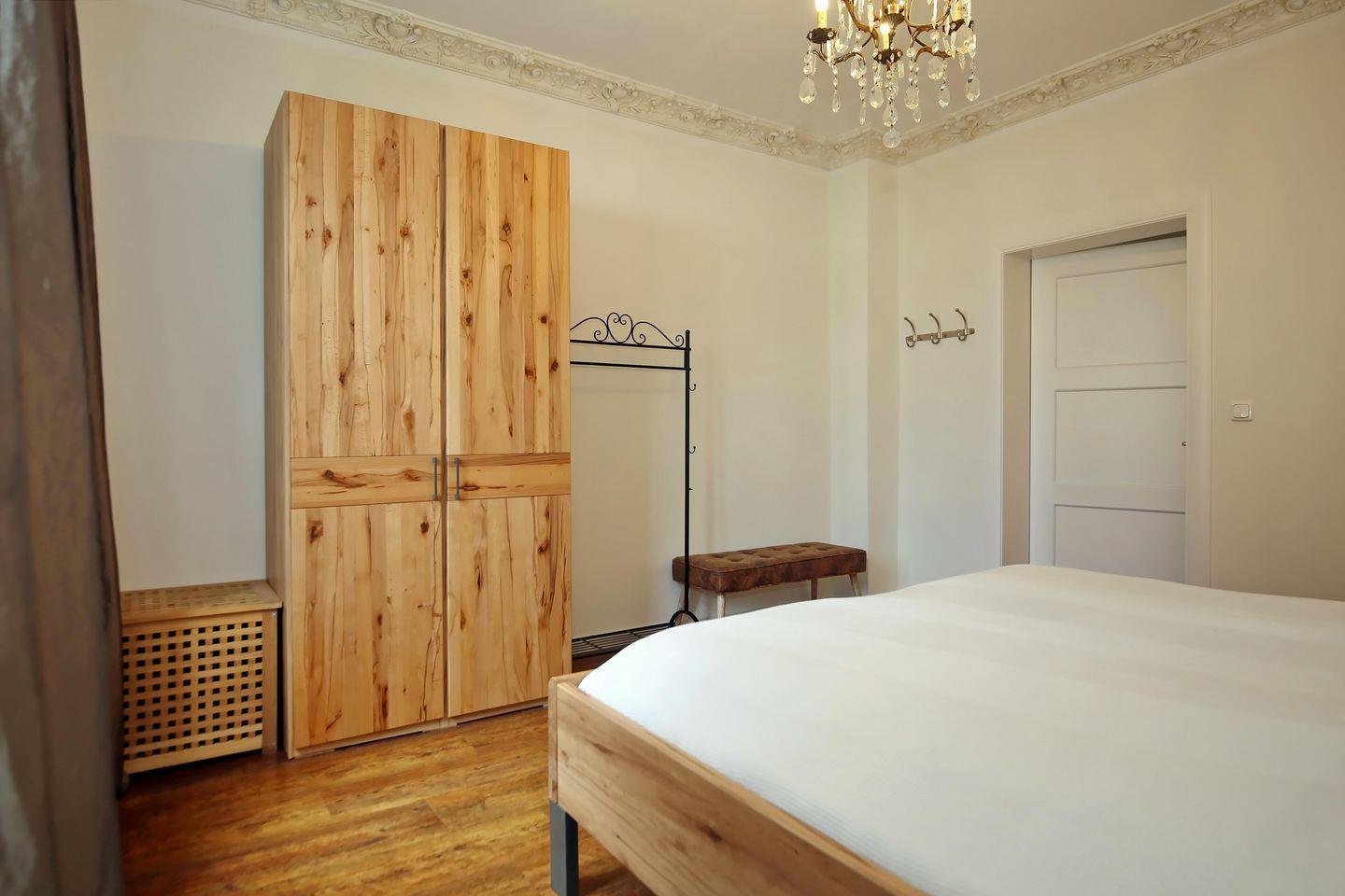 Entspannen kannst du auch in dem großzügig gehaltenen Schlafzimmer mit Doppelbett. Im Kleiderschrank kannst du alle Reiseutensilien bequem verstauen. Zur Verdunklung und als Sichtschutz findest du im Wohn- und Schlafzimmer Vorhänge an den Fenstern.