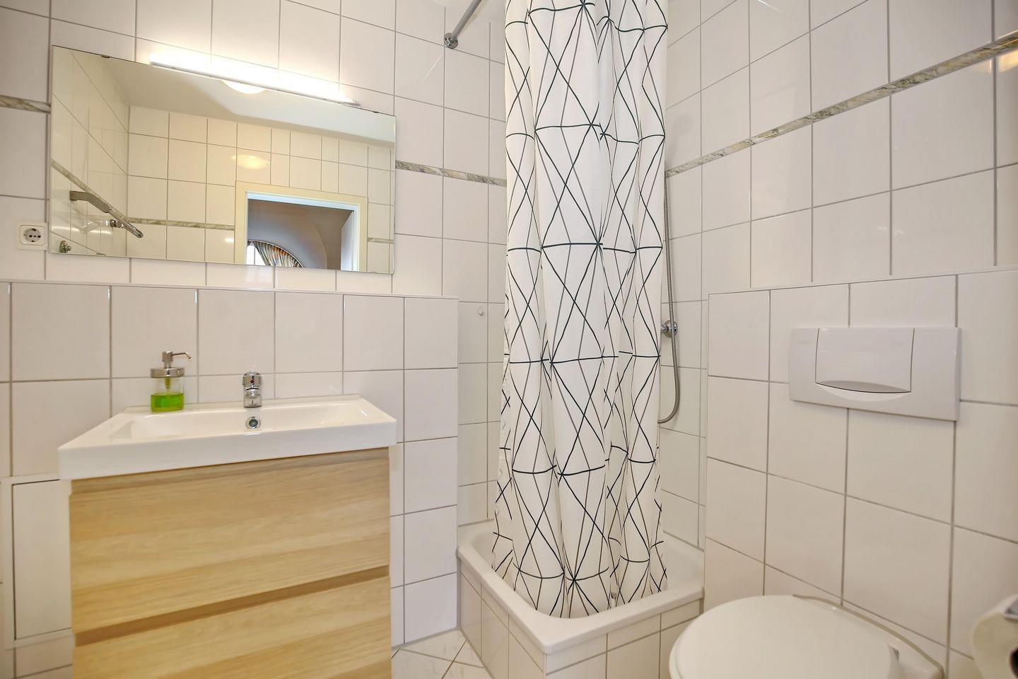 Das Badezimmer mit Dusche und WC ist mit einem Waschtisch mit beleuchtetem Spiegel ausgestattet. Das Duschbad ist gefliest. In der Ferienwohnung sind Fliesen und Teppichboden verlegt.
