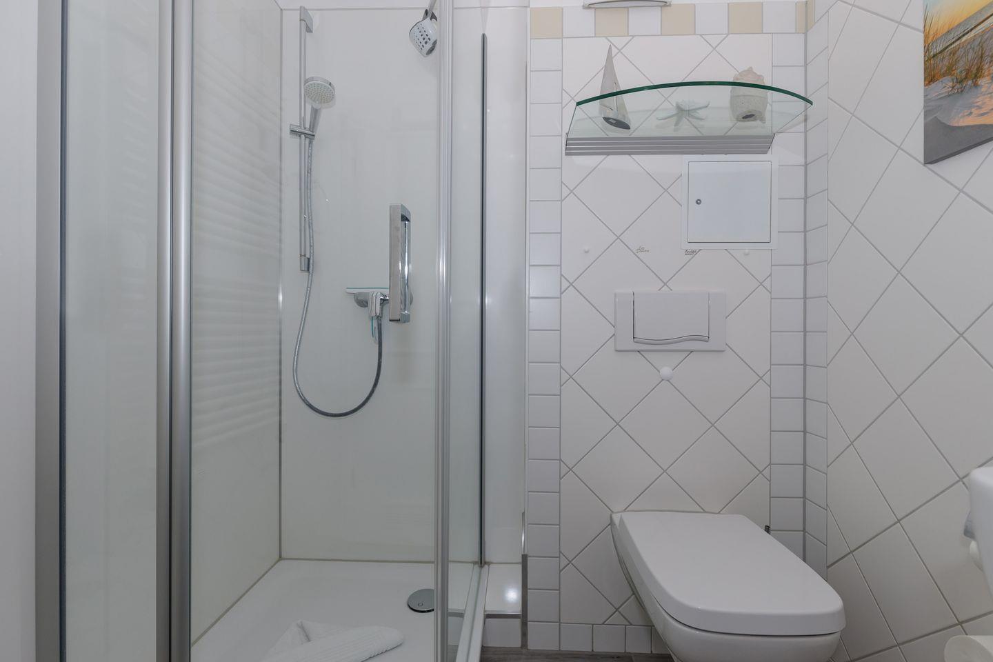 Das moderne Badezimmer ist mit einer großen Dusche, einem Waschbecken und einem WC ausgestattet.