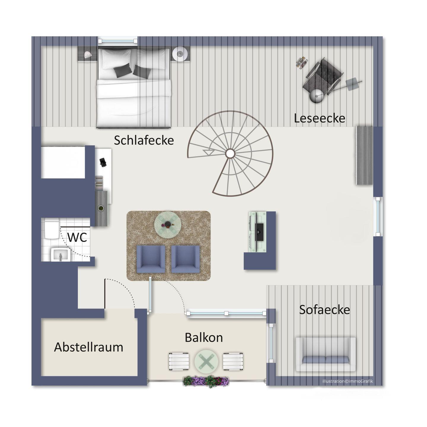 Für erholsame Nächte steht dir in der Schlafnische ein großes Doppelbett (2 x 90 x 200 cm) bereit. Eine Garderobennische und eine Kommode bieten dir Platz für deine Urlaubsgarderobe. Auf der oberen Etage findest du auch das zusätzliche WC. Auf dem ausklappbaren Sofa neben der Loggia lassen sich durch den schwenkbaren TV gemütliche Fernsehabende verbringen. Plissees an den Fenstern dienen als Verdunkelungsmöglichkeit. Über die Wendeltreppe gelangst du vom Dachgeschoss in den Essbereich mit der offenen Küche.