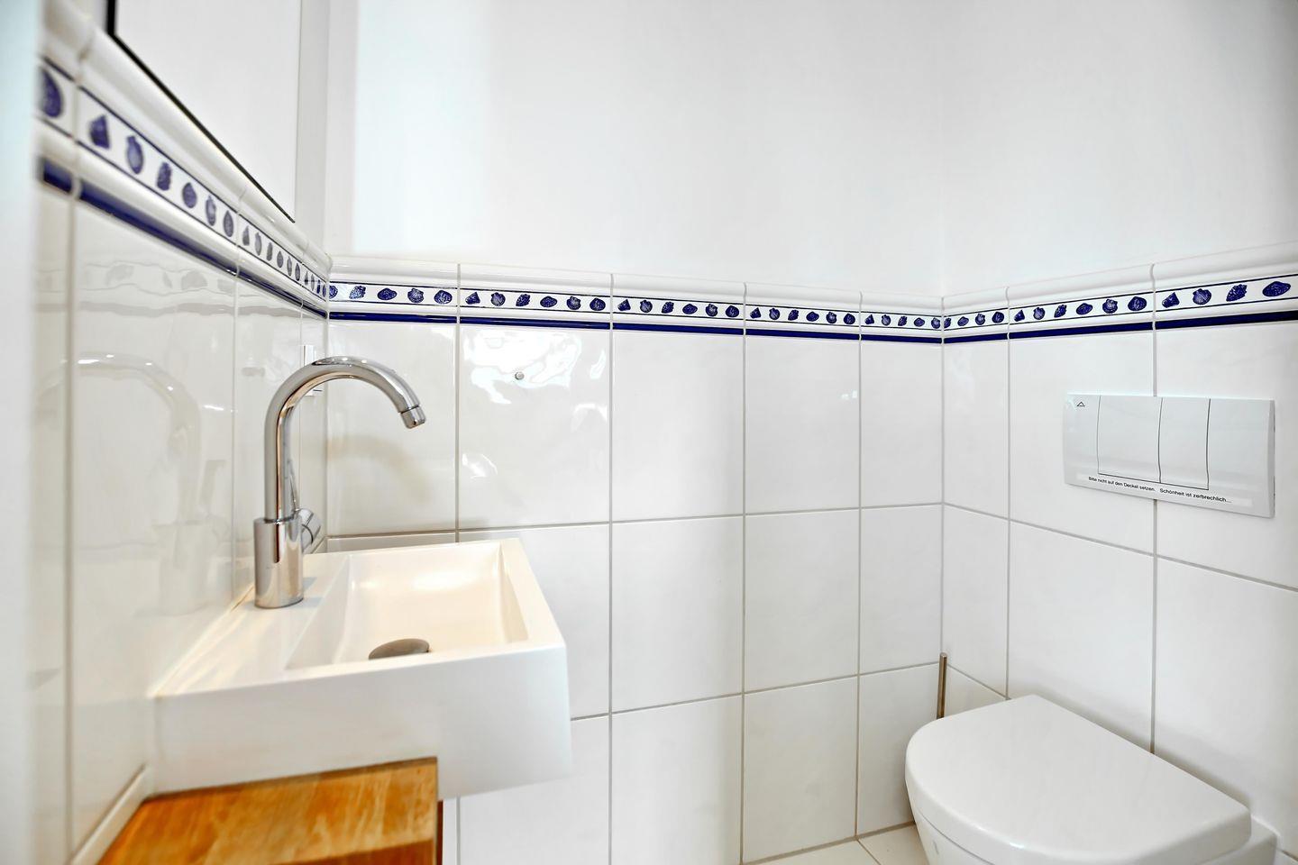 Das moderne Bad ist mit einem Waschtisch, einer Dusche, einem Haartrockner und einem WC ausgestattet. Die gesamte Ferienwohnung verfügt über Fliesen als Bodenbelag.