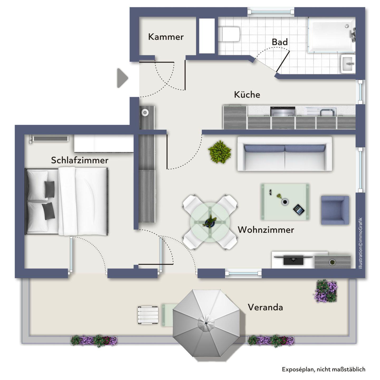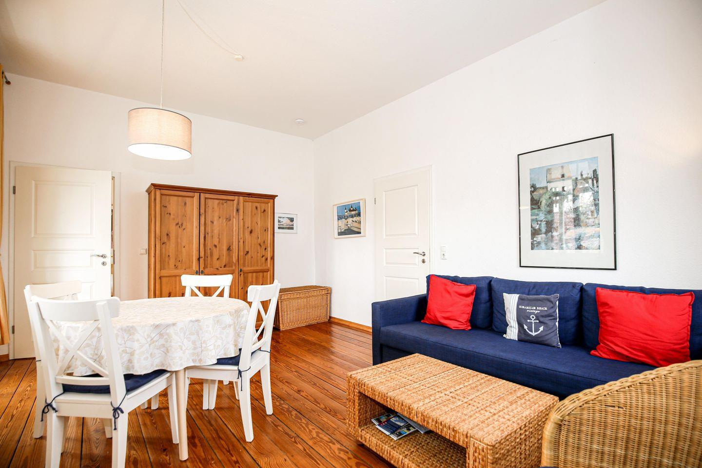 Deine Ferienwohnung liegt im ersten Obergeschoss. Auf 48 m² erwarten dich ein Wohnzimmer mit gemütlicher Essecke, ein Schlafzimmer, ein Duschbad und eine kleine separate Küche. Der Strand ist nur etwa 300m entfernt.