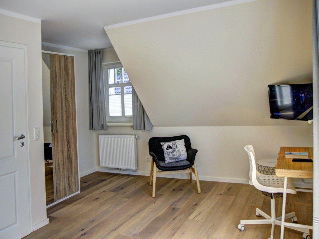 1 Schlafzimmer mit Doppelbett (1,80x2,00m), verstellbare Lattenroste, Kinderreisebett (0,60x1,20m), TV, Zugang zur Dachterrasse