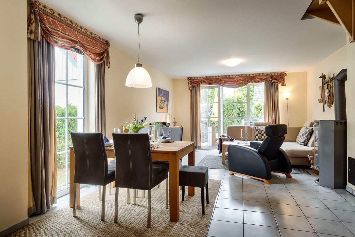 Wohnraum mit Couch, Esstisch für 4 Personen