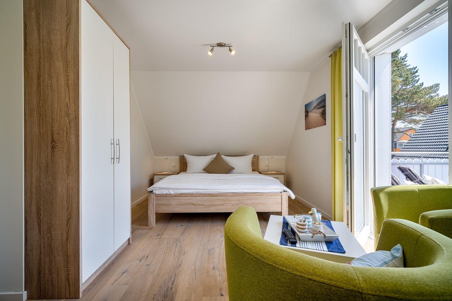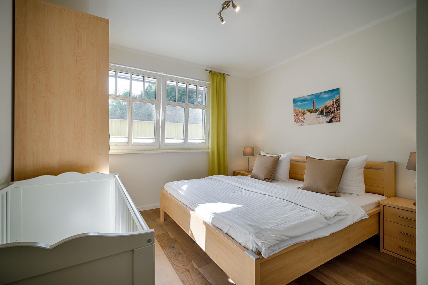1 Schlafzimmer mit Doppelbett (1,80x2,00m), verstellbare Lattenroste, Sat-TV, und eigenem Bad mit ebenerdiger Dusche