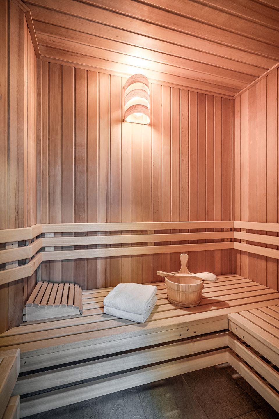 Bad mit ebenerdiger Dusche, anliegender Sauna