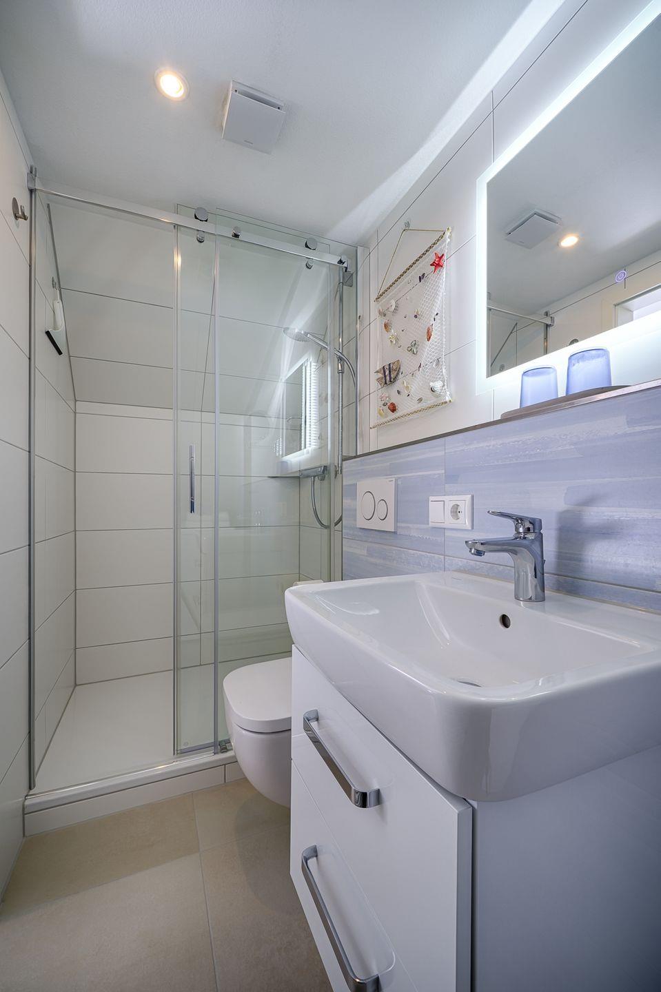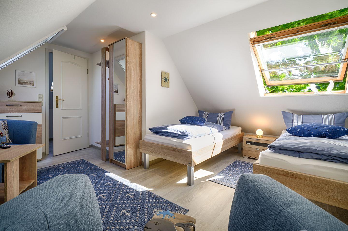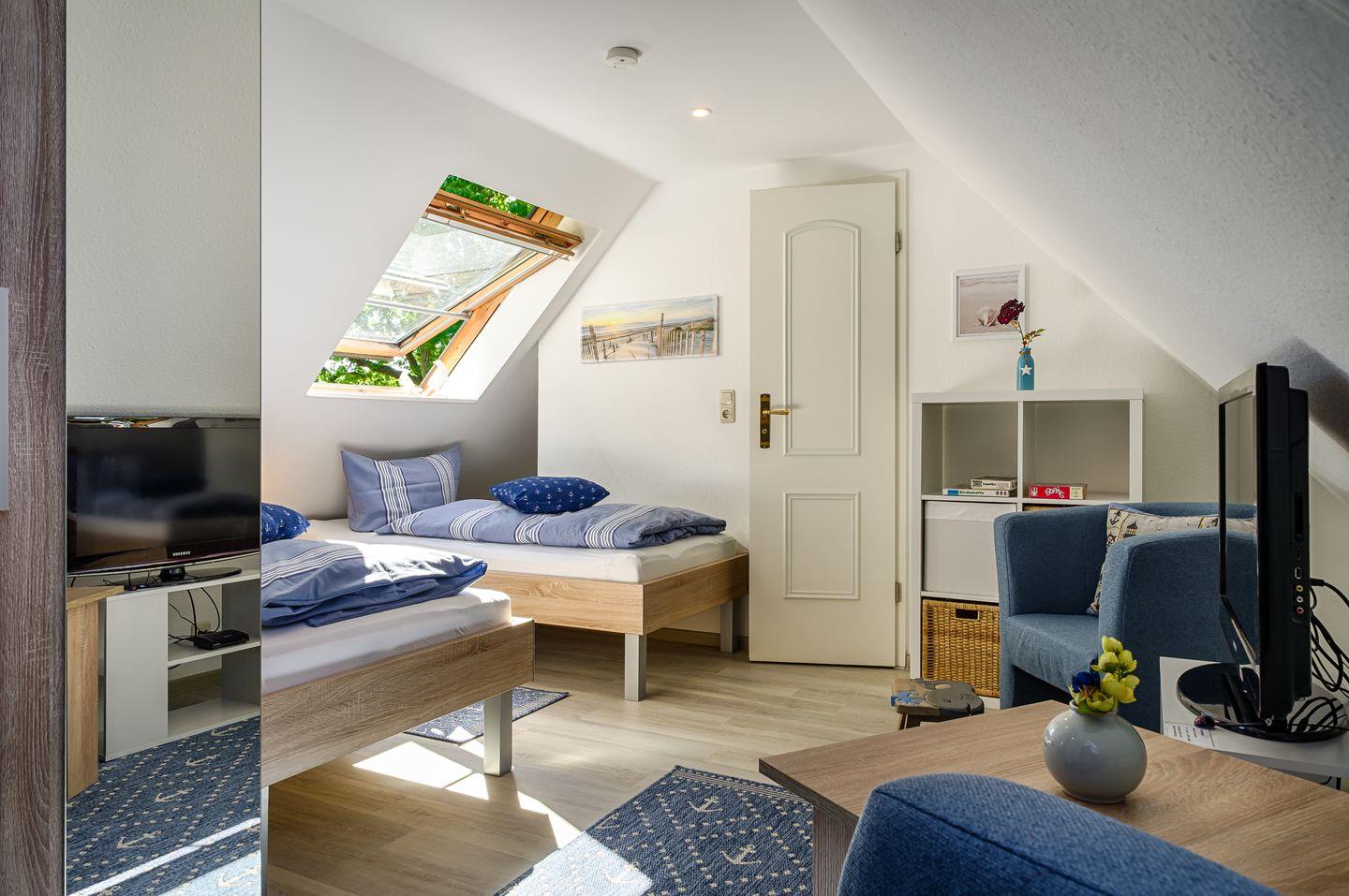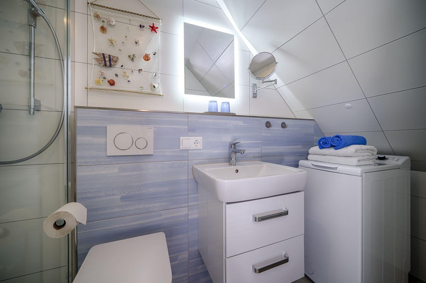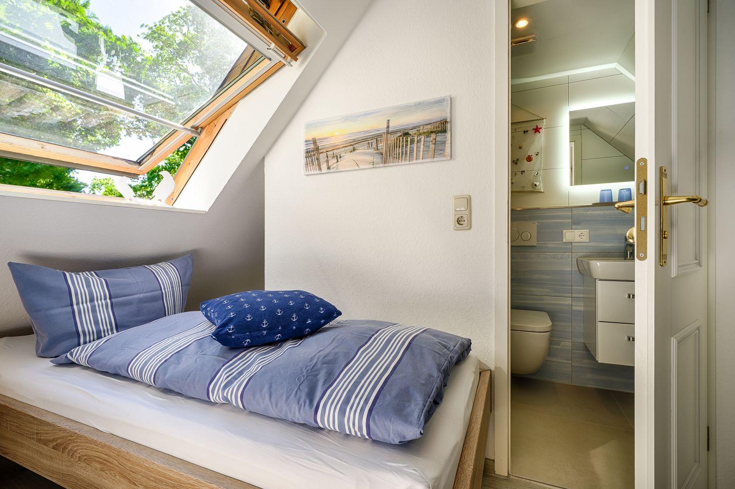 Das Dachgeschoss beherbergt das zweite Schlafzimmer mit zwei Einzelbetten (90 x 200 cm) und TV sowie ein weiteres Bad mit Dusche, WC und Waschmaschine.