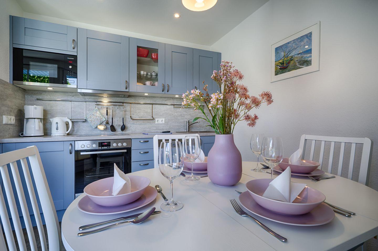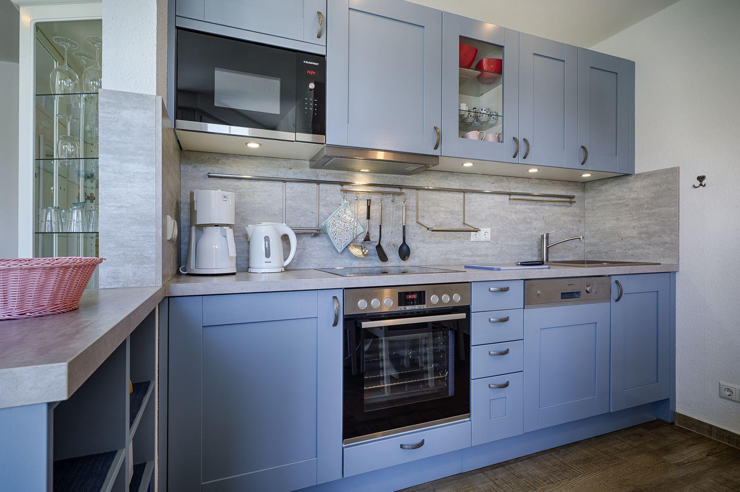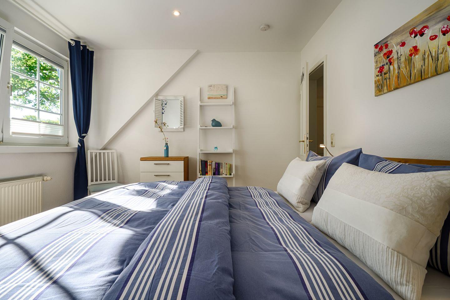 Die moderne Küchenzeile ist mit einem Backofen, Geschirrspüler, Herd, Kaffeemaschine, Kühlschrank mit Gefrierfach, Toaster und Wasserkocher ausgestattet, sodass Sie sich hier problemlos selbst versorgen können. Das erste Schlafzimmer im Obergeschoss verfügt über ein großes Doppelbett (180 x 200 cm) und sorgt für eine erholsame Nachtruhe.