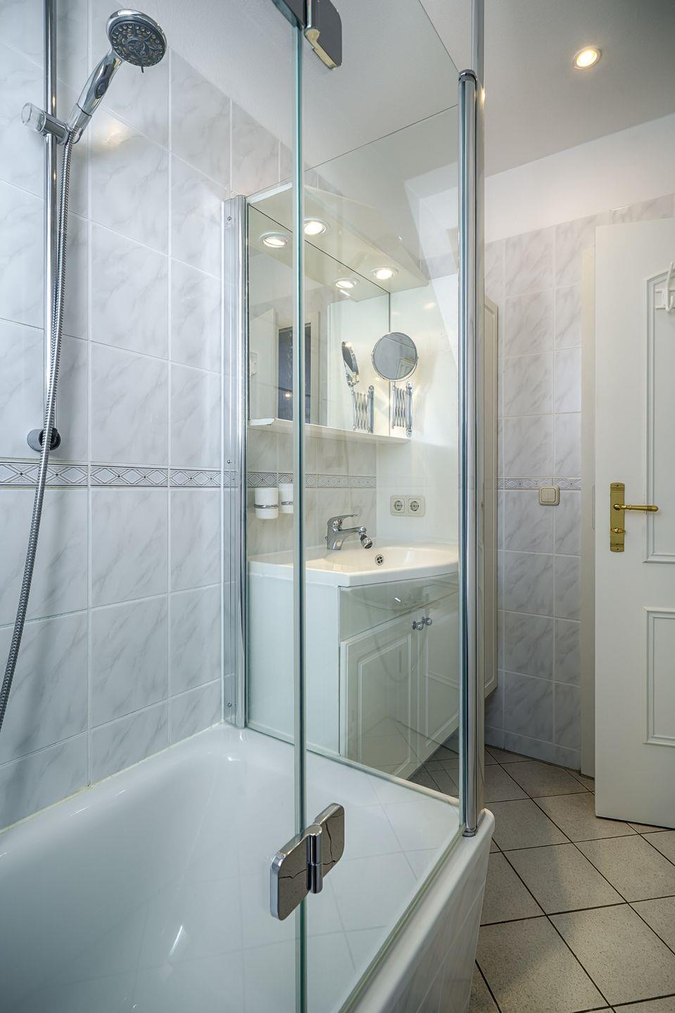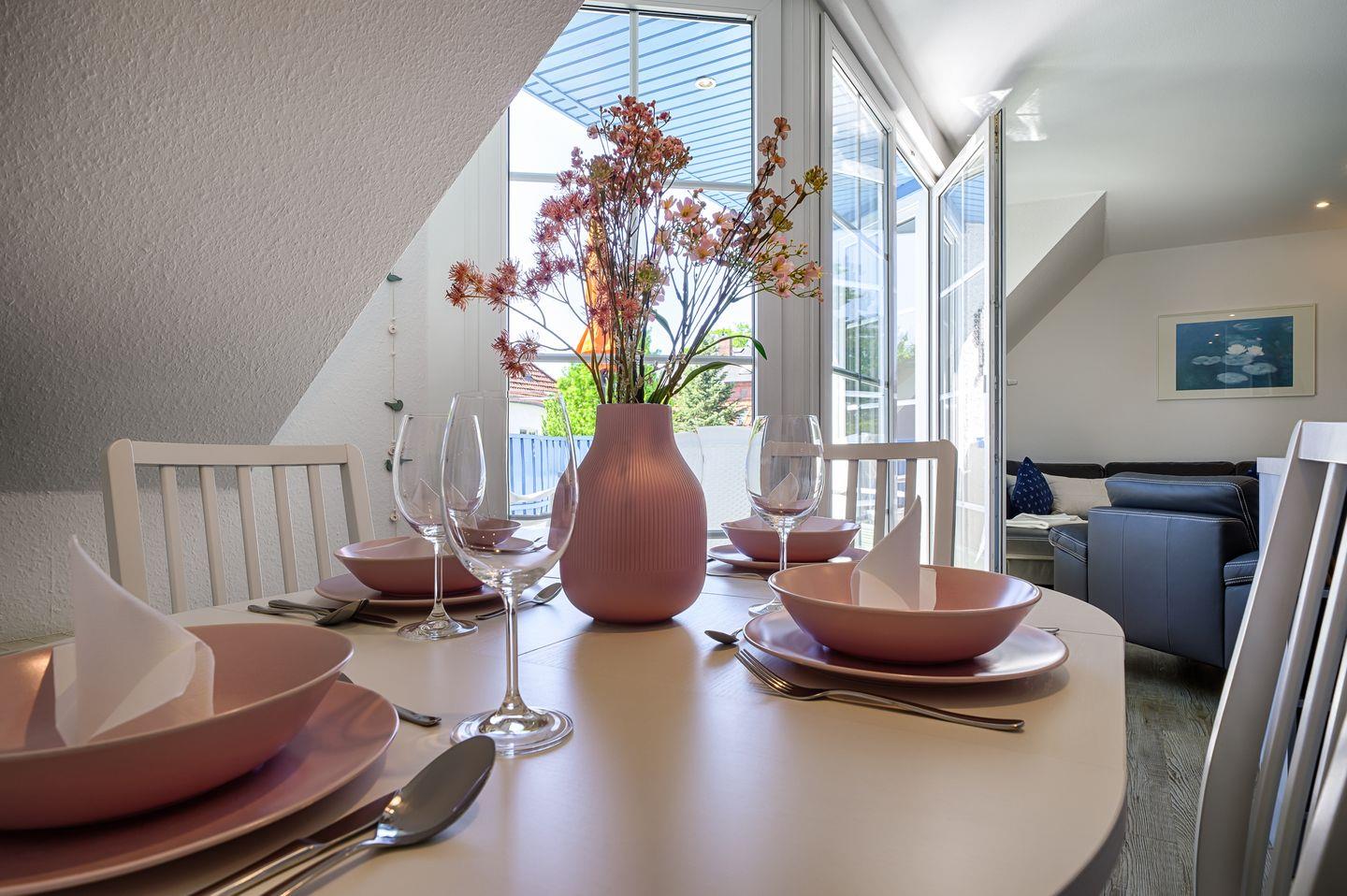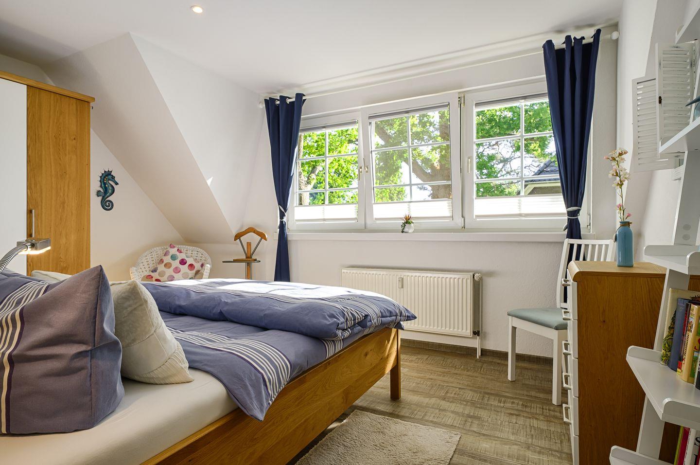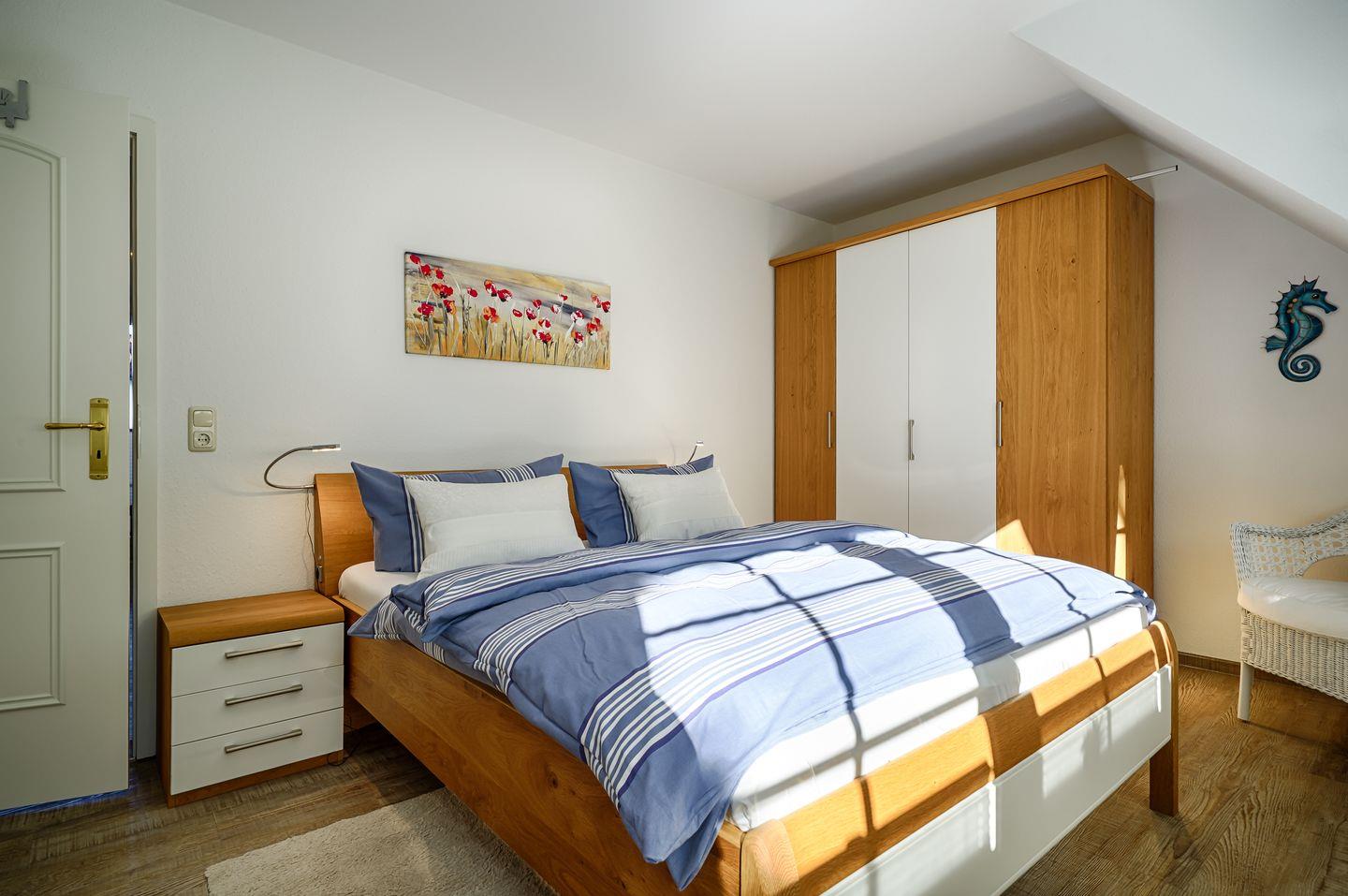 Ferienwohnung bis 4 Personen | ca. 90 m² Wohnfläche | OG Wohnbereich mit Küchenzeile, Bad, 1 Schlafzimmer | DG Bad, 1 Schlafzimmer | West-Loggia | 1 Parkplatz | Wohnbereich Esstisch, Sitzgarnitur, Radio mit CD/DVD-Player, SAT-TV | Küchenzeile Backofen, Geschirrspüler, Herd, Kaffeemaschine, Kühlschrank mit Gefrierfach, Toaster, Wasserkocher | 2 Bäder Badewanne, WC im OG | Dusche, WC, Waschmaschine im DG | 2 Schlafzimmer 1 Doppelbett (180 x 200 cm) im OG | 2 Einzelbetten (90 x 200 cm) im DG | Kinderhochstuhl, Reisebett, Waschmaschine, WLAN