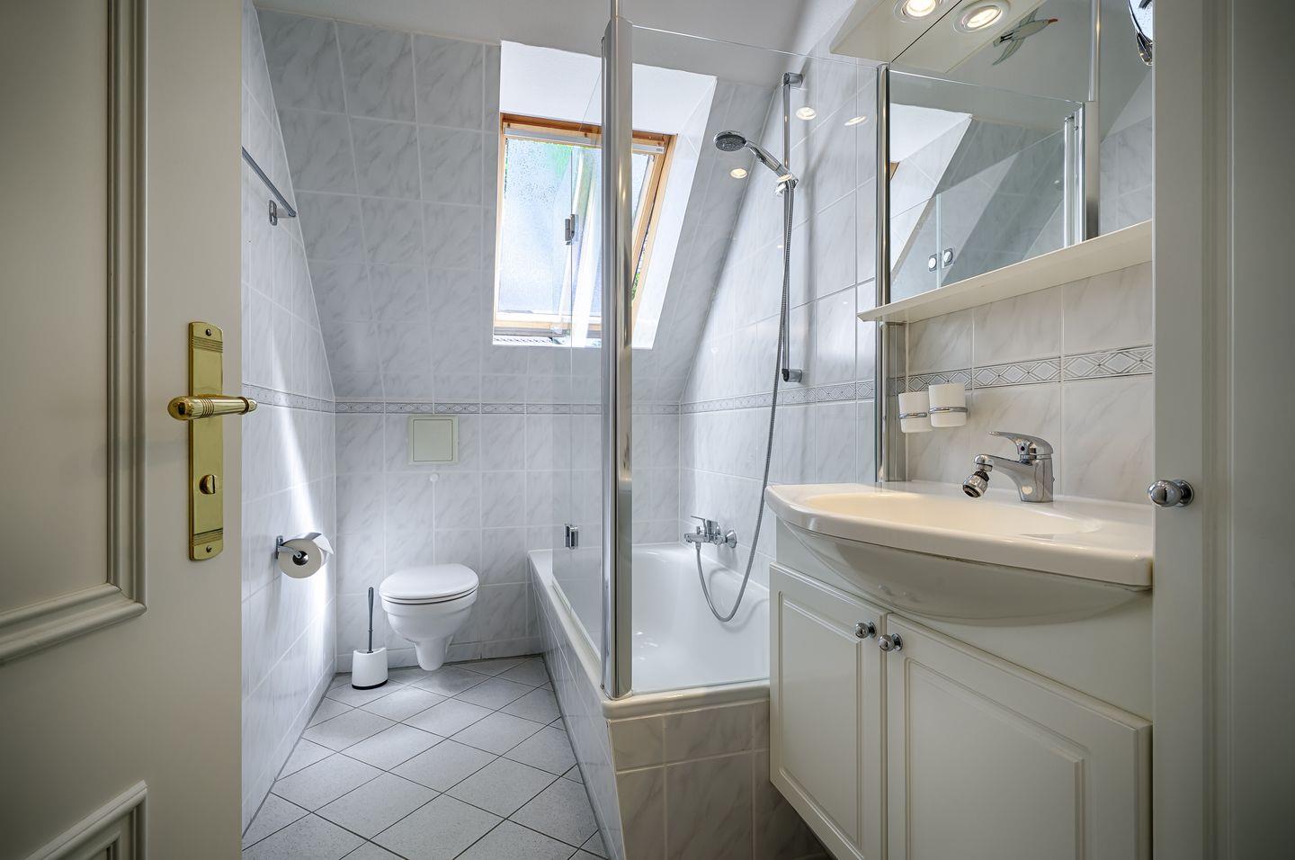 Ebenfalls im Obergeschoss befindet sich ein Badezimmer mit Badewanne und WC.
