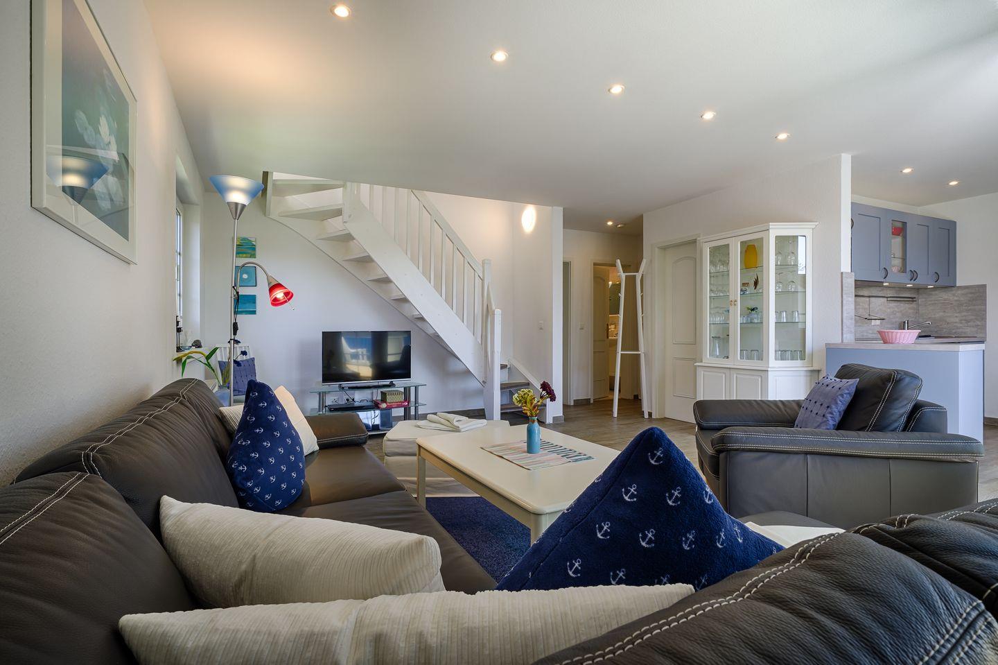 Diese großzügige Ferienwohnung für bis zu 4 Personen bietet auf ca. 90 m² Wohnfläche eine komfortable Unterkunft auf zwei Etagen. Sie befindet sich im Ober- und Dachgeschoss eines gepflegten Hauses und eignet sich hervorragend für Familien oder kleinere Gruppen. Im Obergeschoss erwartet Sie ein offener Wohnbereich mit einer gut ausgestatteten Küchenzeile, einem Esstisch und einer gemütlichen Sitzgarnitur. Zur Unterhaltung stehen ein Radio mit CD-Player sowie SAT-TV zur Verfügung.