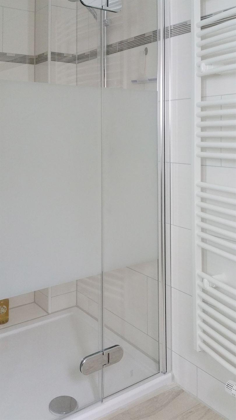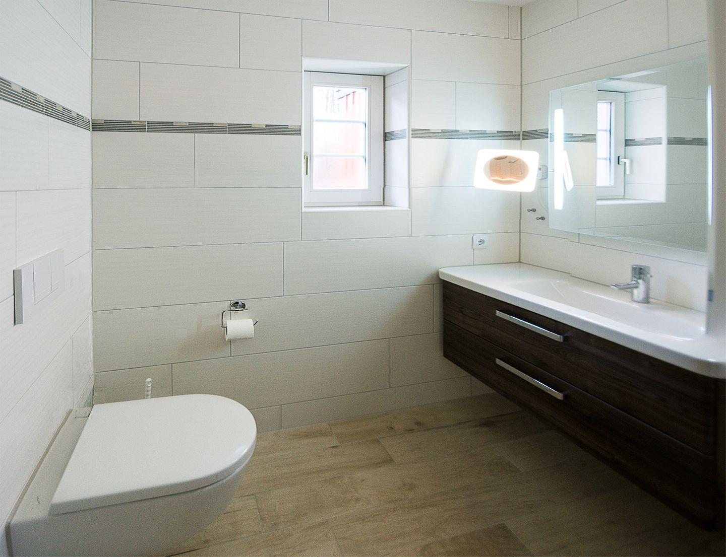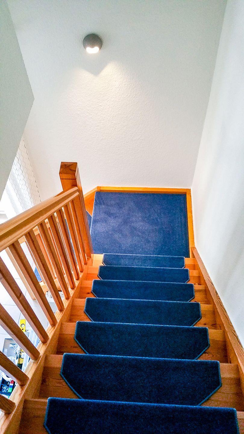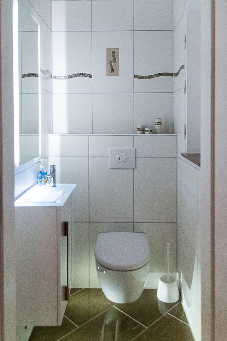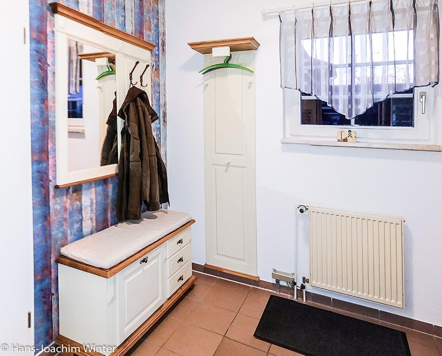 Direkt an den Wohnbereich grenzt eine Flur, der als Windfang dient und über eine Garderobe verfügt. Das Badezimmer im Erdgeschoss ist mit einer bodengleichen Dusche (mit "Living Colors") und einem WC ausgestattet.